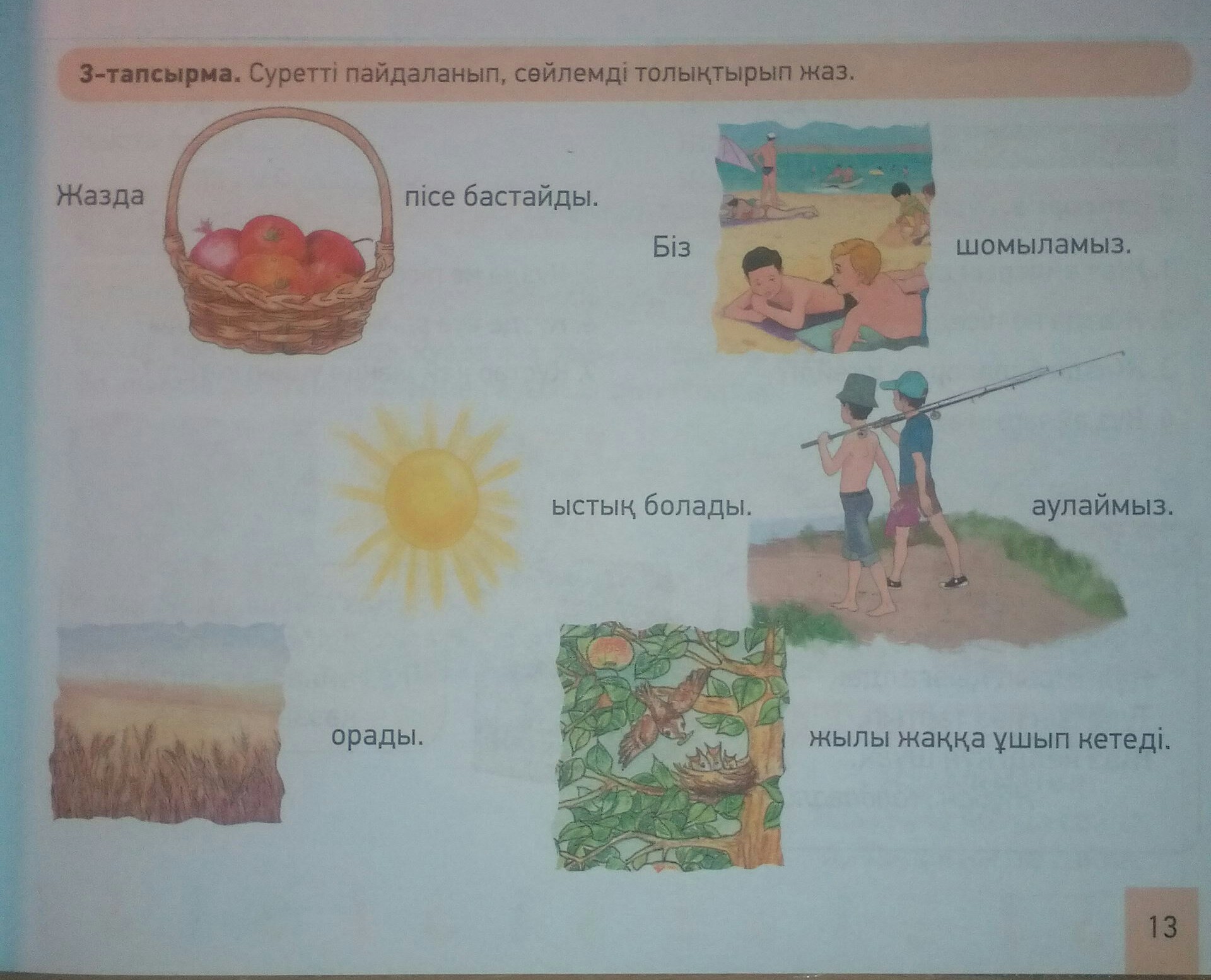 Жазда алма пісе бастайды. Біз көлде шомыламыз. Балық аулаймыз. Күн ыстық болады. Бидай орамыз. Құстар жылы жаққа ұшып кетеді.
