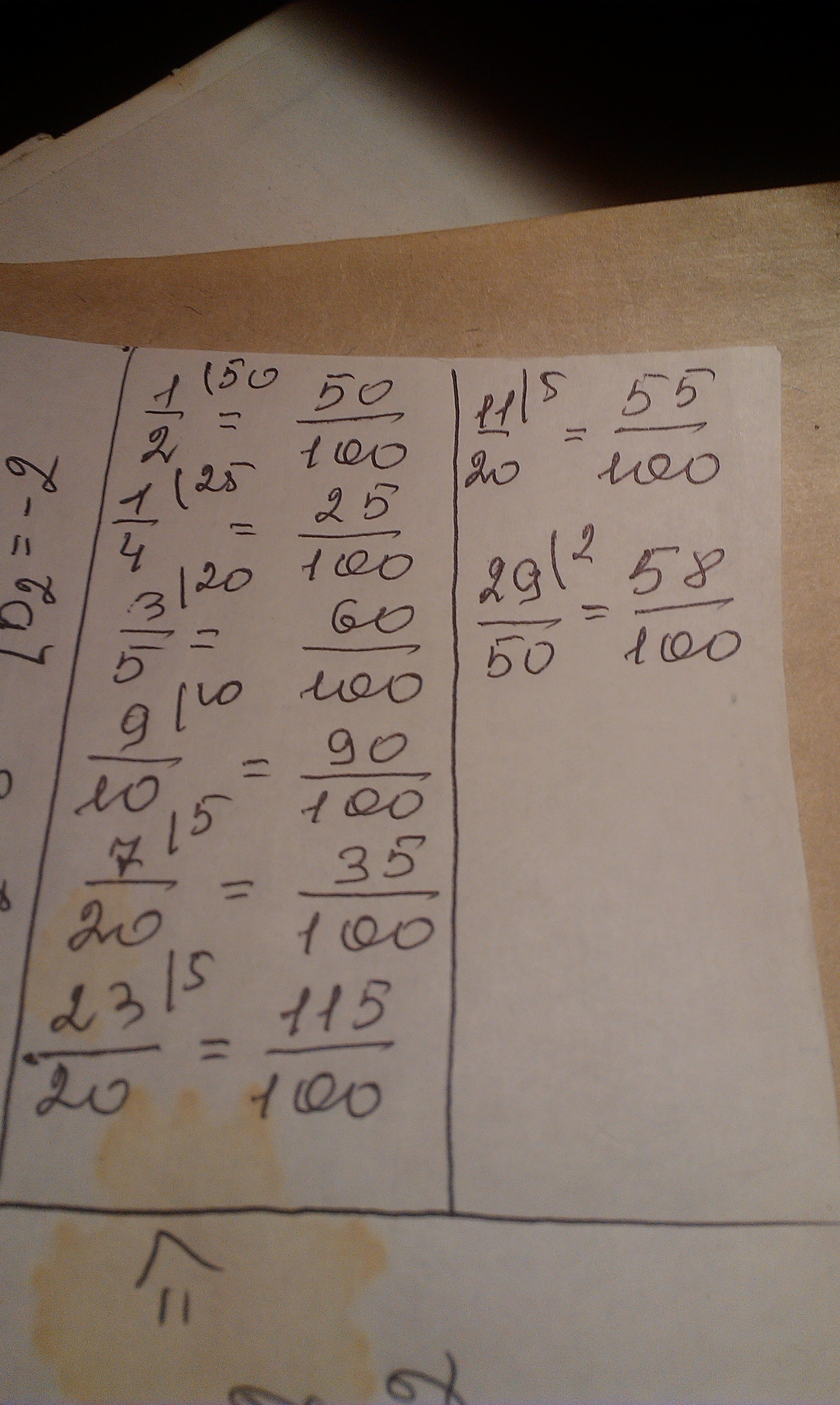 Замените Каждую из следующих дробей дроби знаменатель которой равен 100 1/ 2 1/4 3/5 9 /10 7/20 23/20 11/20 29/50