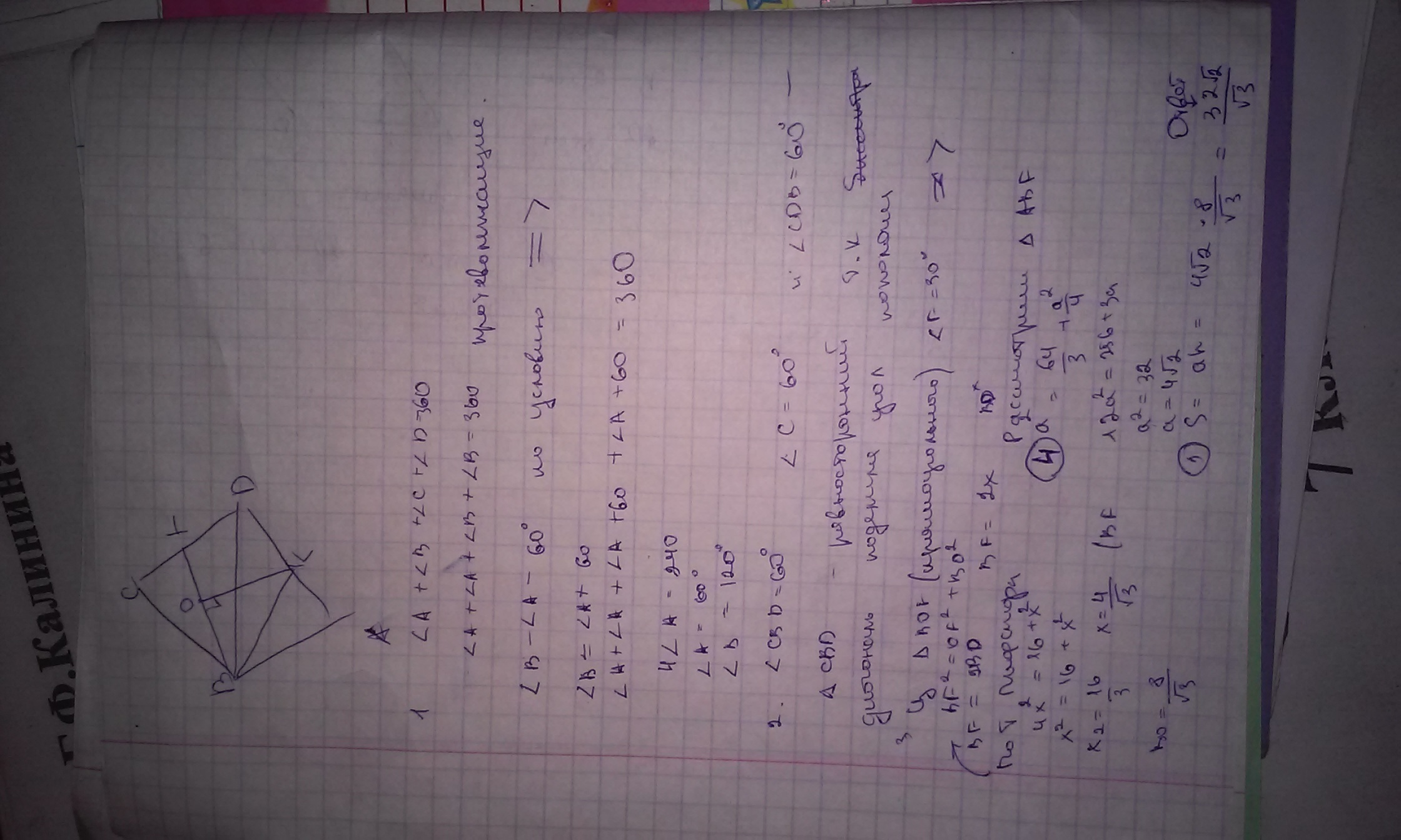 В ромбе ABCD угол А на 60 градусов меньше угла B , отрезки BF и BT биссектрисы треугольников ABD и BDC соответственно,. Вычислите площадь ромба если расстояние от точки F до прямой BT = 4 см
