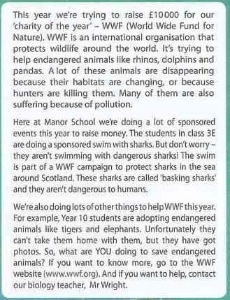 В этом году мы делаем множество других вещей,чтобы помочь Всемирному фонду природы. К примеру,10-классники "усыновляют" вымирающих животных,таких как тигров и слонов. К сожалению,они не могут забрать их домой,но у них есть фото. Так что ты делаешь для сохранения животных,находящихся под угрозой? Если хочешь узнать больше,перейди на сайт Всемирного фонда природы. А если ты хочешь помочь,свяжись с нашим учителем биологии,мистером Райтом.
