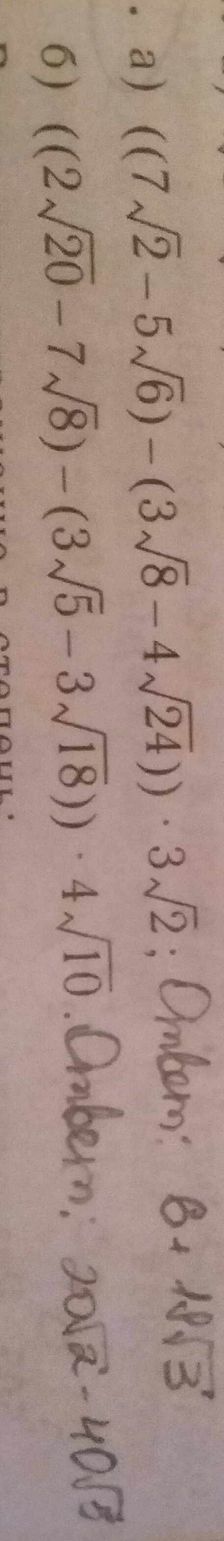 1) ((7 sqrt{2}-5 sqrt{6})-(3 sqrt{8}-4 sqrt{24}  ))*3 sqrt{2}=    \ (7 sqrt{2}-5 sqrt{6}-6sqrt{2}+8sqrt{6}  )*3 sqrt{2}=(sqrt{2}+3 sqrt{6} )*3 sqrt{2}= \ =3*2+9 sqrt{12}=6+9*2 sqrt{3}  =6+18 sqrt{3}   \  \ 2)((2 sqrt{20}-7 sqrt{8}  )-(3 sqrt{5} -3 sqrt{18} ))*4 sqrt{10}= \   (4sqrt{5}-14 sqrt{2}  -3 sqrt{5} +9 sqrt{2})*4 sqrt{10}= ( sqrt{5}-5 sqrt{2}  )*4 sqrt{10}= \ 4 sqrt{50}-20 sqrt{20}=4*5 sqrt{2}-20*2 sqrt{5}= 20 sqrt{2}-40 sqrt{5}