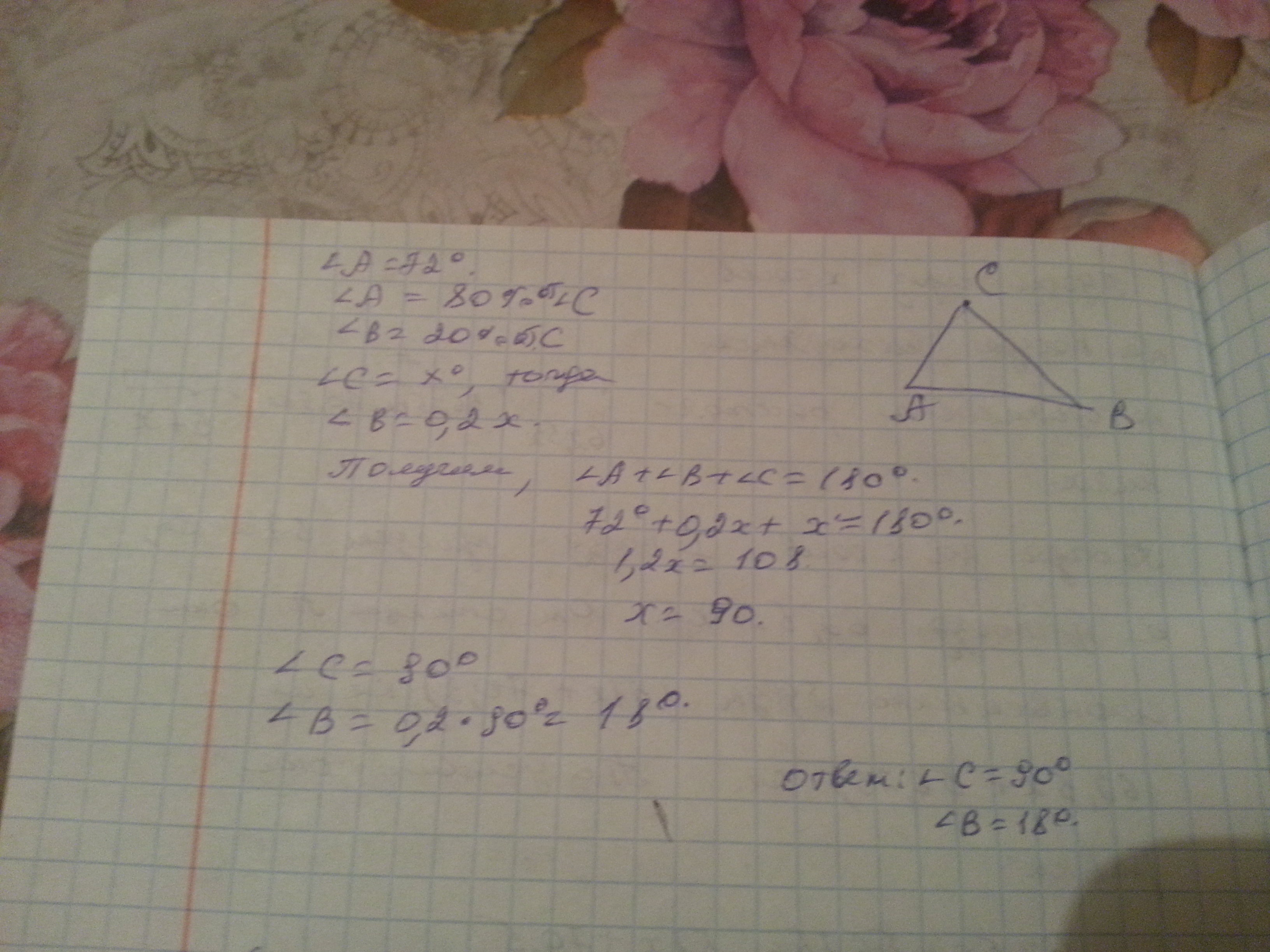 В треугольнике ABC угол A=72градуса, он составляет 80%, а угол B 20% от угла C. Сколько градусов содержат угол Bи угол C треугольника ABC