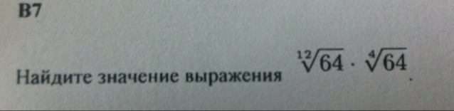 sqrt[12]{64}cdotsqrt[4]{64}=64^{frac1{12}}cdot64^{frac14}=64^{frac1{12}+frac14}=64^{frac13}=sqrt[3]{64}=4