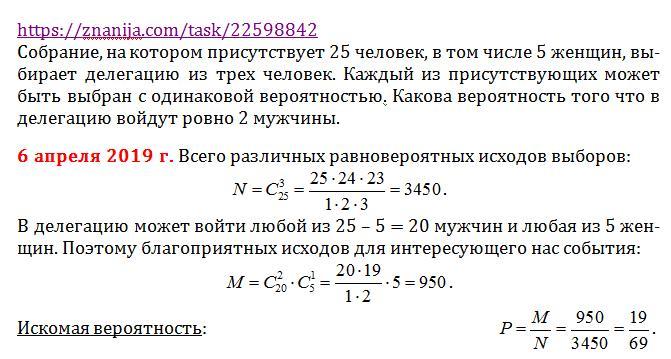 Собрание, на котором присутствует 25 человек, в том числе 5 женщин, выбирает делегацию из трех человек. Каждый из присутвующийх может быть выбран с одинаковой вероятности какова вероятьность то что в делегацию войдут ровна 2 мужчины