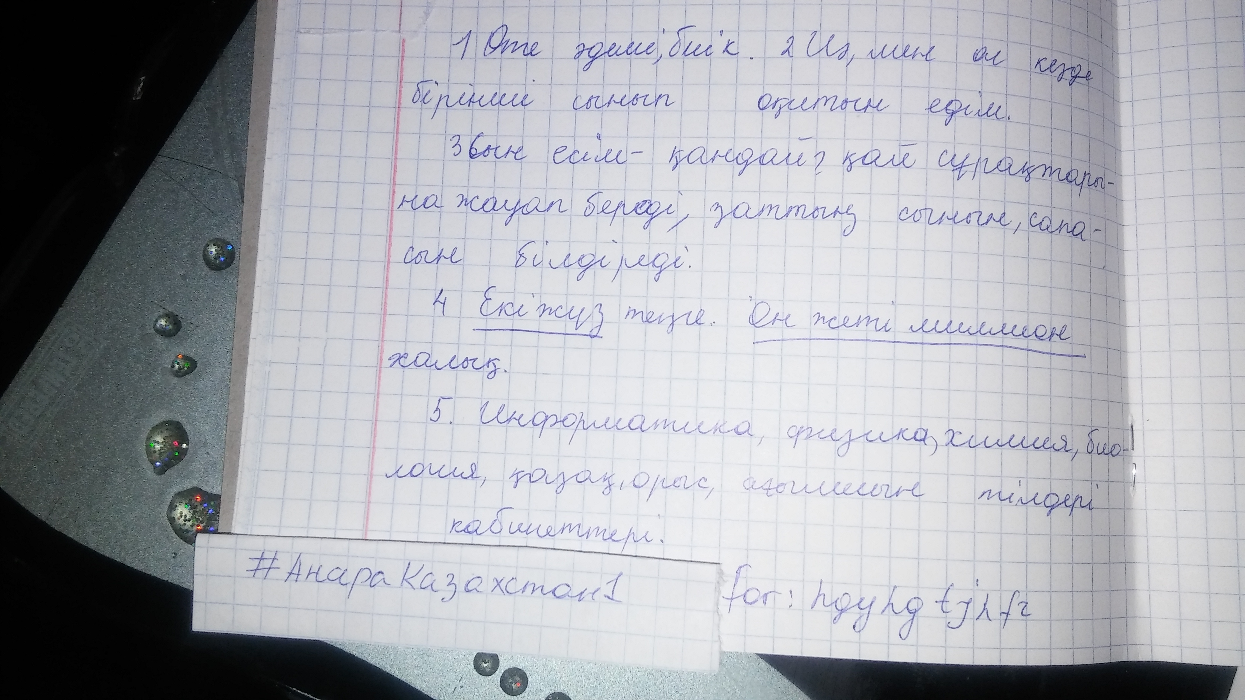 Бақылау сұрақтарына жауап беріп,тапсырмаларды орындаңдар. 1.Сенің оқитын мектебің қандай?Суреттеп жазыңдар. 2.Мектепке алғаш барған кезің есіңде ме? 3.Сын есім дегеніміз қандай сөз табы? 4.Есептік сан есімге сөз тіркестерінен мысалдар келтіріңдер. 5.Мектепте қандай кабинеттер бар?