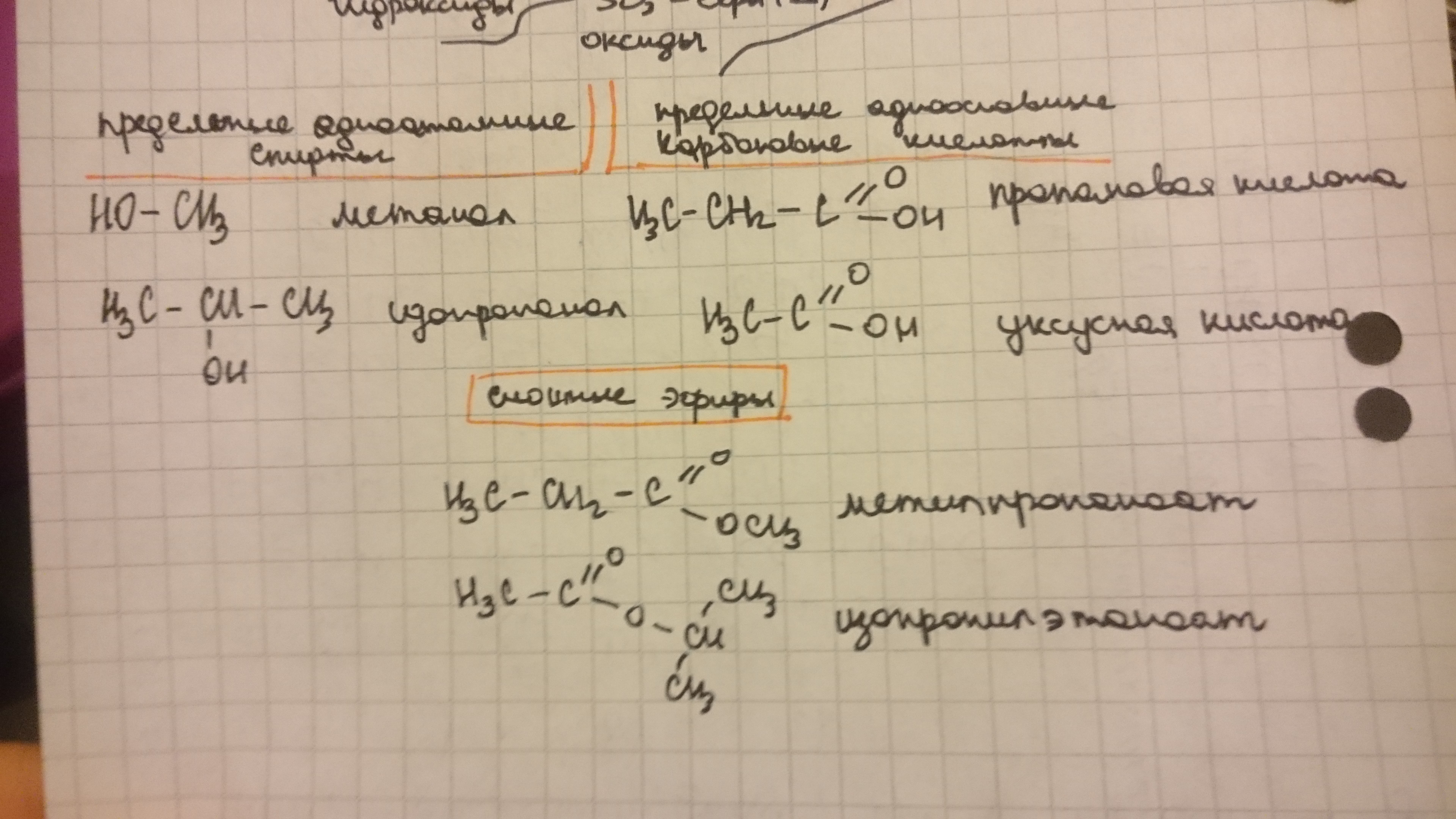 предельные одноатомные спирты, предельные одноосновные карбоновые кислоты, сложные эфиры.