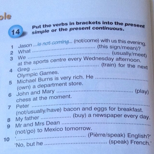2 do you mean 3 usually meet 4 is training 5 owns 6 are playing 7 doesn't usually have 8 buys 9 aren't going 10 does petter speak speaks