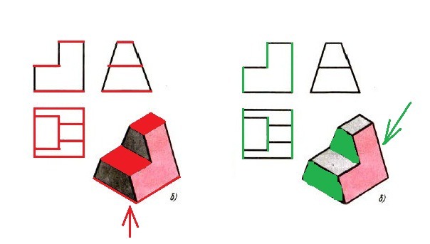 2. На рисунке 87, б дано изображение детали. Сосчитайте, сколько вершин имеет изображенный предмет. Если вы затрудняетесь сделать подсчет, обозначьте вершины буквами. Сосчитайте, сколько ребер и граней у предмета. Сколько у предмета ребер и граней, параллельных горизонтальной плоскости проекций? Покажите их на проекциях. Сколько ребер и граней, перпендикулярных горизонтальной плоскости проекций? Покажите их на изображении. Если вы затрудняетесь решить задачу, сделайте предмет из какого-либо материала и поставьте его, как на рисунке 87. Пусть плоскость стола — это горизонтальная плоскость проекций. Попробуйте теперь, сравнивая изображение и предмет, правильно ответить на вопросы.
