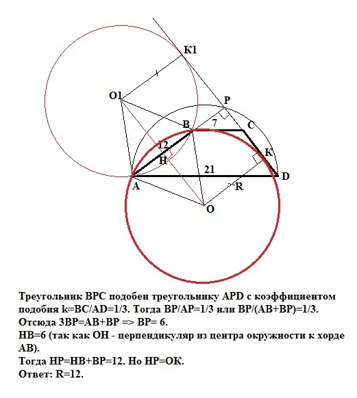 Построение рисунка: на основании трапеции CD=21, как на диаметре, строим окружность. Тогда ЛЮБАЯ точка Р на полуокружности даст нам прямой угол. Соединим точки АР и DP прямыми и "встроим" отрезок ВС=7 в треугольник APD параллельно основанию AD.