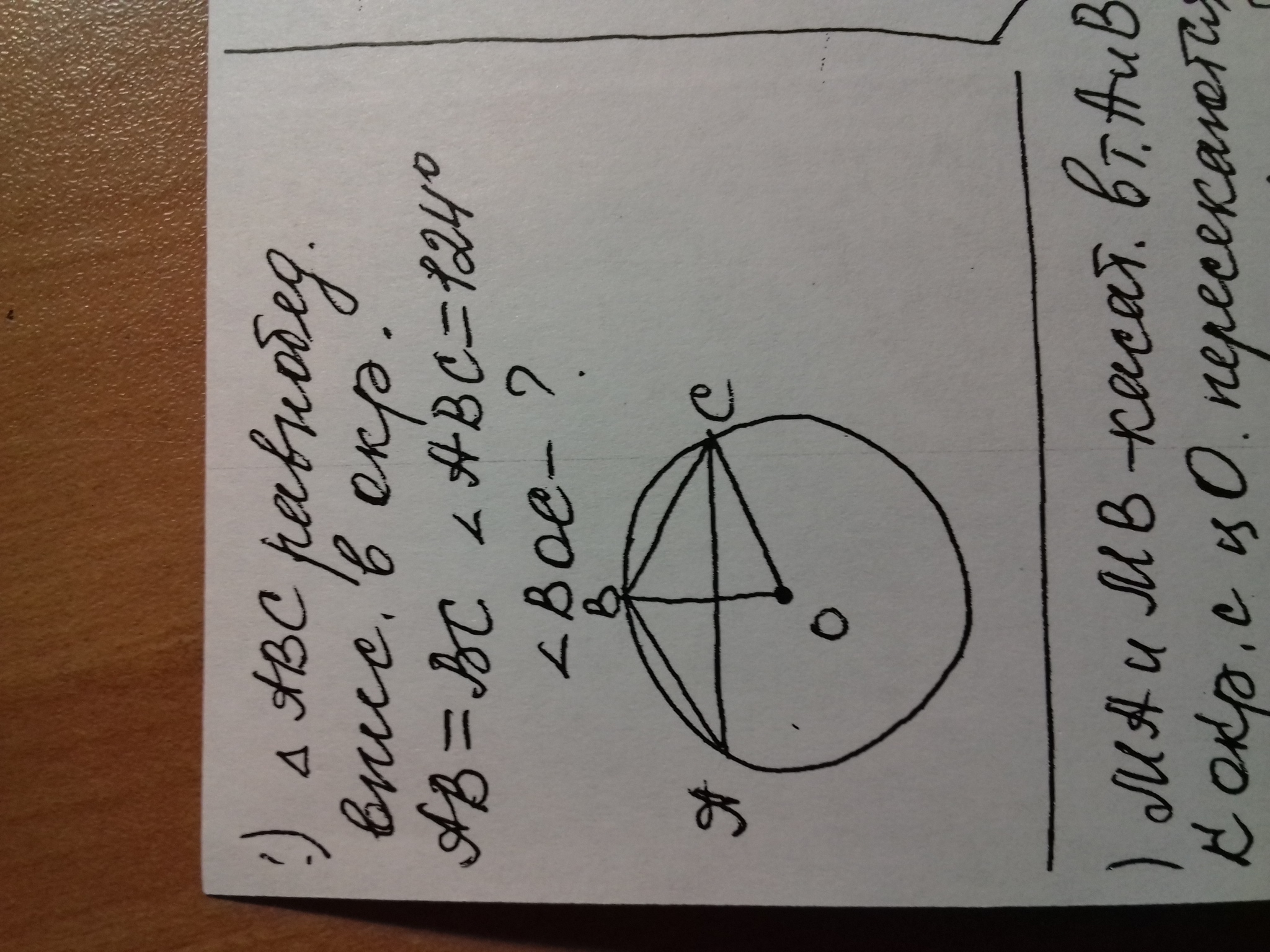 треугольник равнобедренный, вписан в окружности, АВ=ВС угол АВС=124 градуса
