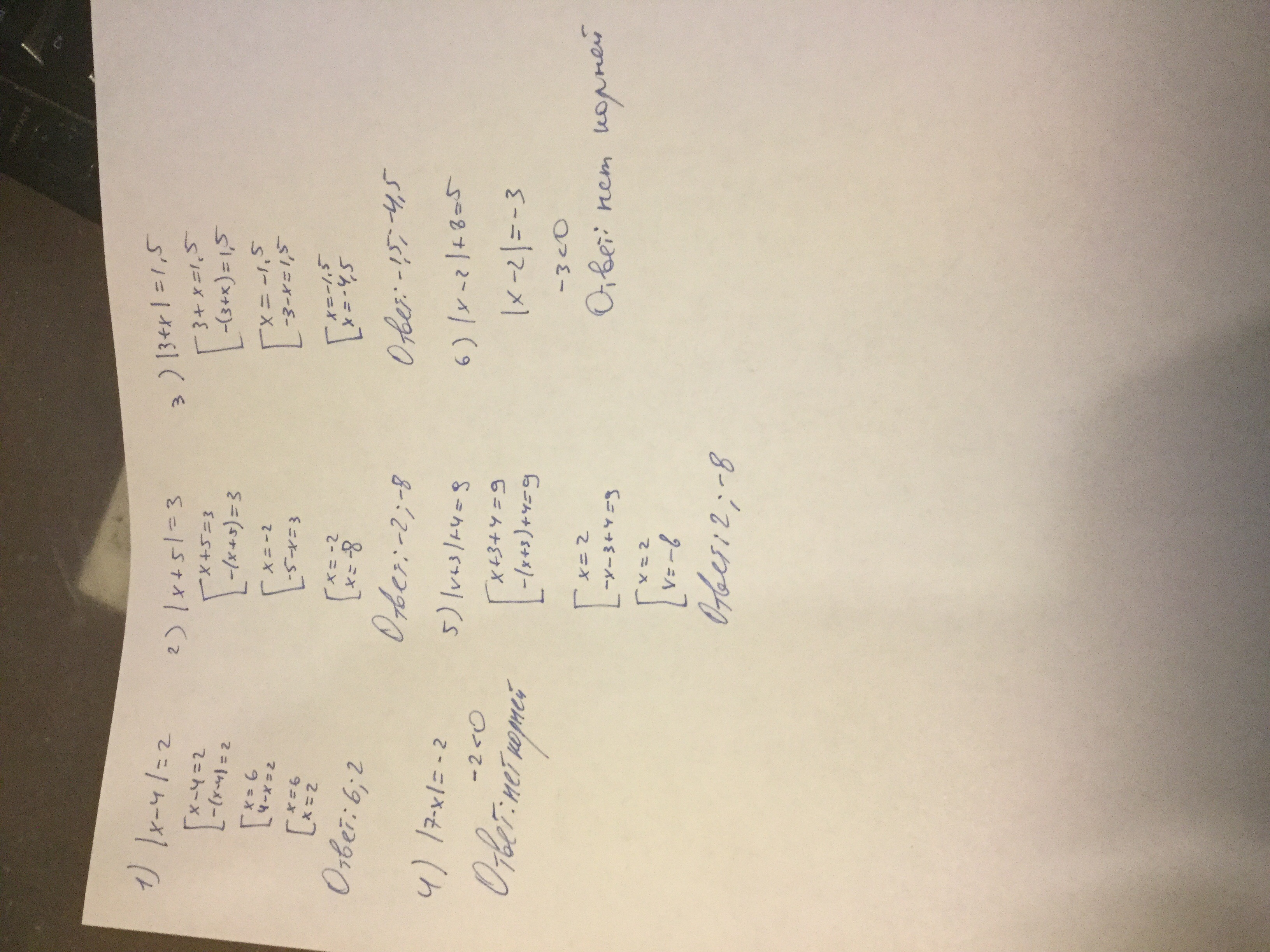 Как решить уровнени? 1) |×-4|=2, 2) |×+5|=3, 3) |3+×|=1,5, 4) |7-×|= -2, 5) |×+3|+4=9, 6) |×-2|+8=5 скажите пж!!!