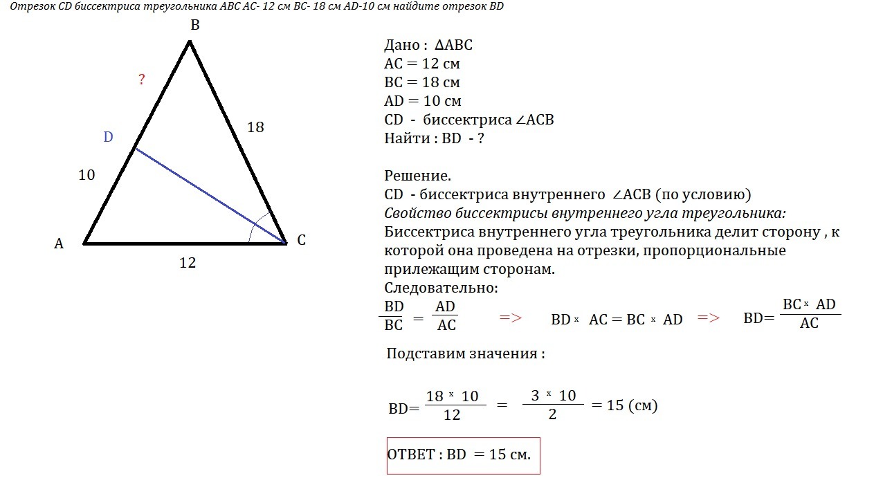 Биссектриса треугольника делит третью сторону на отрезки, пропорциональные двум другим сторонам. Отсюда АДАС = ВДВС