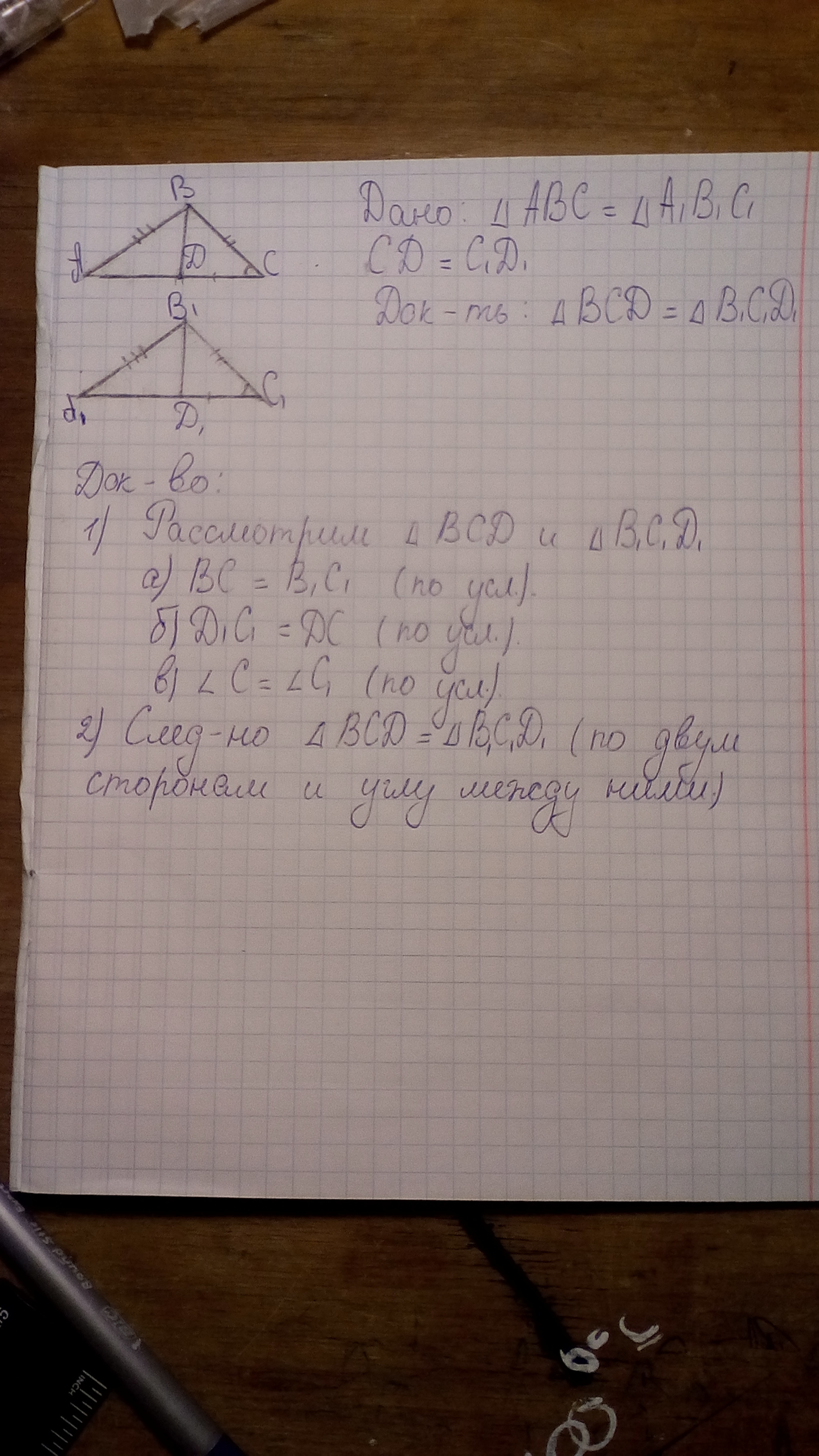 Треугольник ABC = треугольнику A1 B1 C1 . На их сторонах AC и A1 C1 отложены равные отрезки CD и C1 D1 . Докажите , что треугольник BCD = треугольнику B1 C1 D1