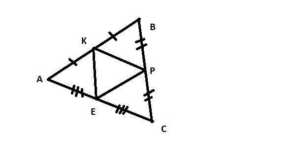 Точки K,P и E середины сторон AB ,BC и AC треугольника ABC. Периметр треугольника ABC равен 24 см. Чему равен периметр треугольника KPE