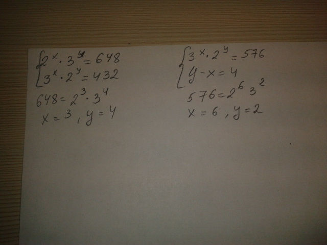 {2^x*3^y=648⇒2^x*3^y=2³*3^4⇒x=3,y=4