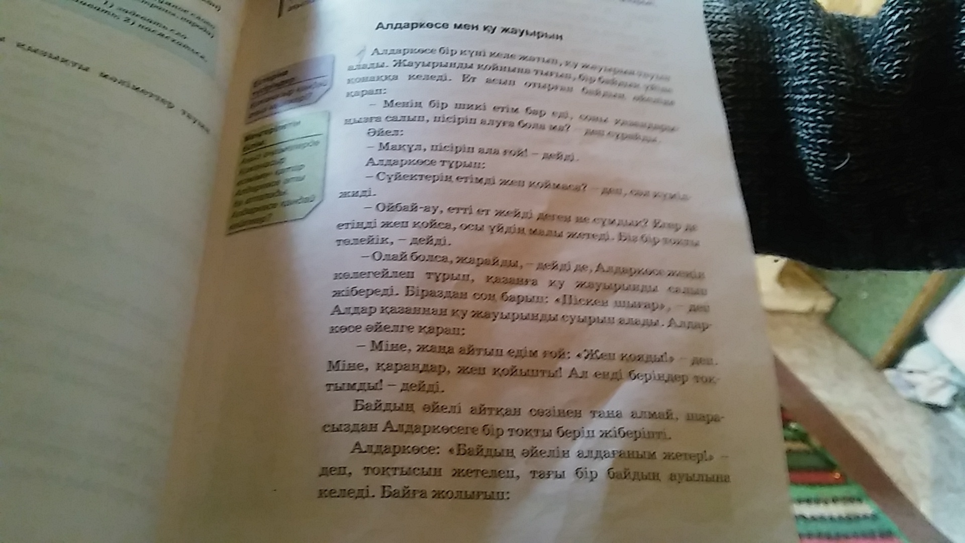 шел однажды Алдар косе и нашел баранью косточку (лопатку). положил себе в карман и пошел в гости к одному баю. Видит жена бая варит мясо в казание и говорит: есть у меня кусочек сырого мяса, можно и я его в вашем казане сваю?
