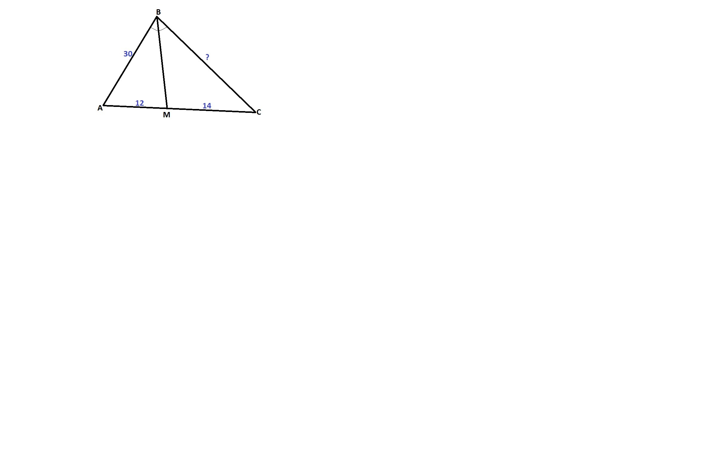 Отрезок BM- биссектриса треугольника ABC,AB=30см,AM=12см,MC=14см.Найдите сторону BC.Пожалуйста помогите.