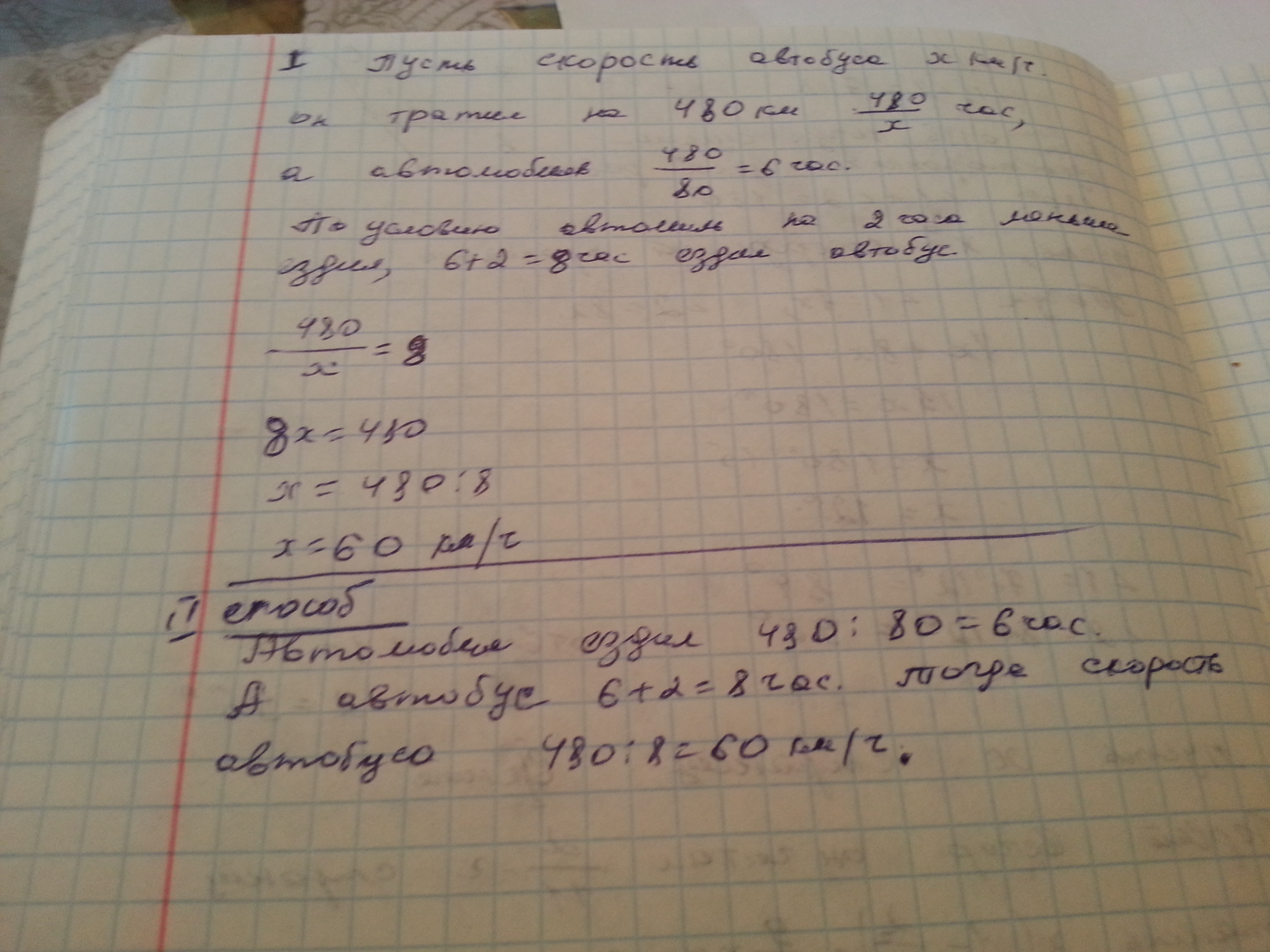 расстояние между двумя городами 480км.Из первого города выехали автомобиль и автобус .Автомобиль приехал на два часа раньше . если скорость автомобиля 80км/ч, то нацдите скорость автобуса