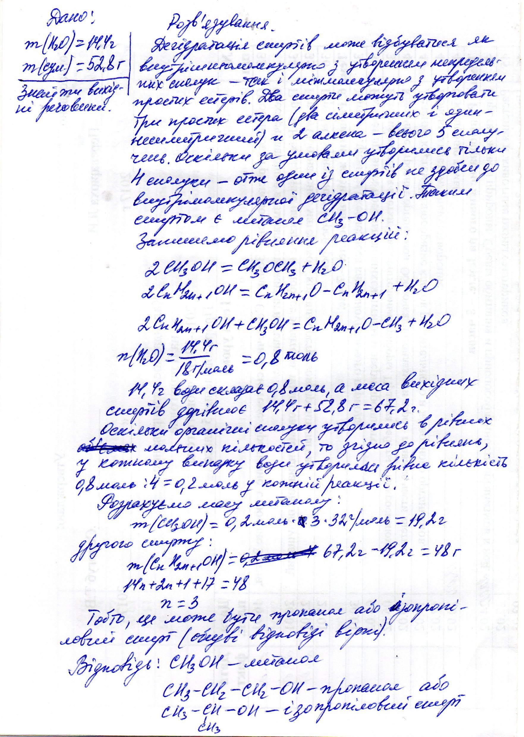 При кількісній дегідратації суміші двох насичених одноатомних спиртів виділилось 14,4 г води і утворилось 52,8 г еквімолярної суміші чотирьох органічних сполук. Встановіть будову вихідних речовин.