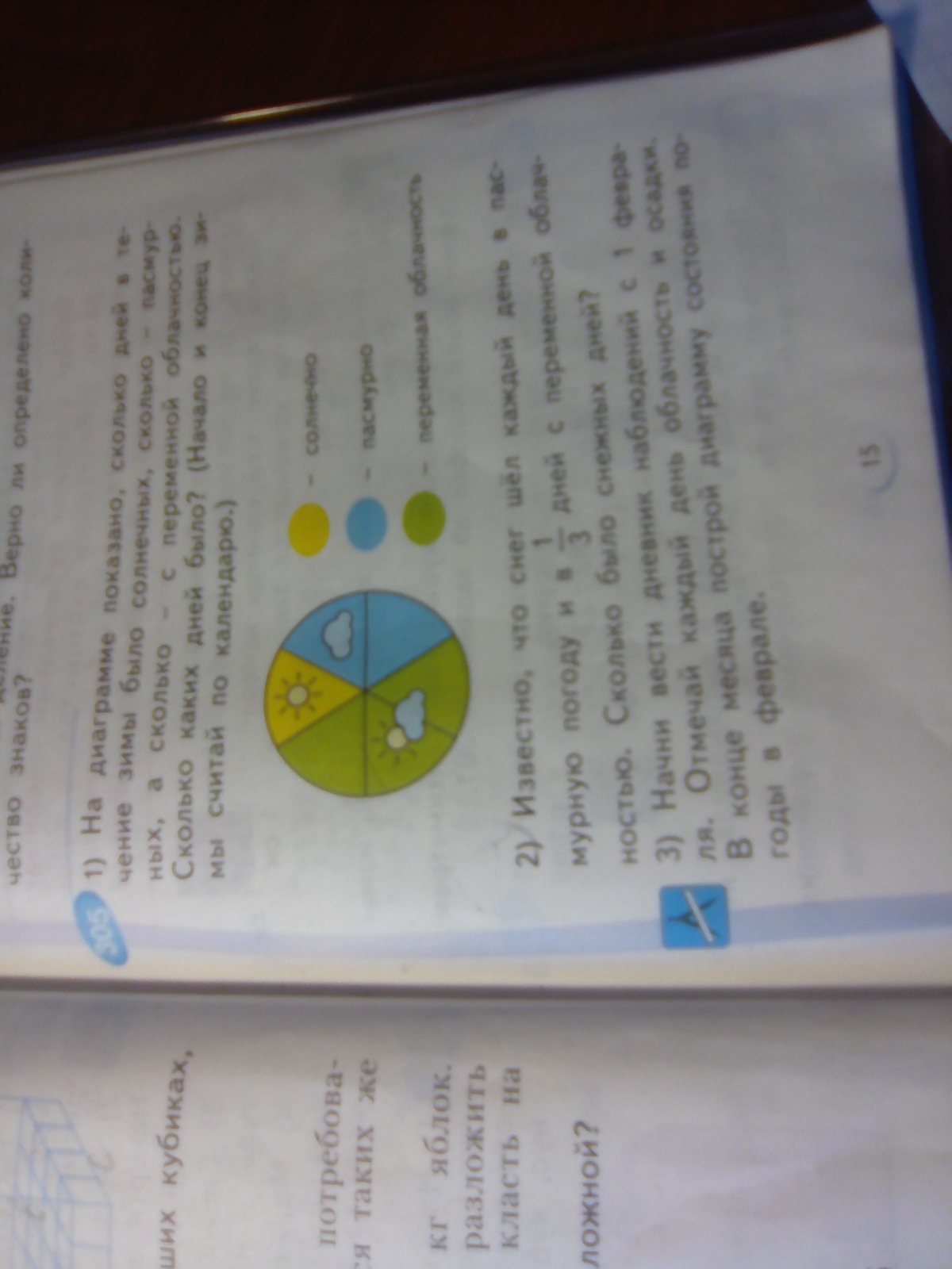 на диаграмме показано Сколько дней в течение зимы было солнечных сколько пасмурных А сколько с переменной облачностью сколько дней было начало и конец зимы считай по календарю 2 задание к этому же номеру известно что снег шел каждый день в пасмурную погоду и одну третью дней с переменной облачностью Сколько было белоснежных дней