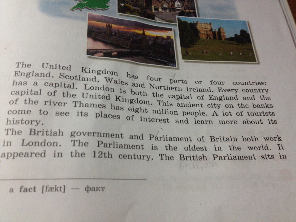 Соединенное королевство разделено на 4 части 4 странами: Англия, Шотландия, Вейлс и Северная Ирландия. Лондон - столица и Англии, и Соединённого королевства. Это старый город на берегах реки Темзы населен 8 миллионами людей. Туристы приезжают сюда, чтобы посмотреть на достопримечательности и чтобы узнать историю.