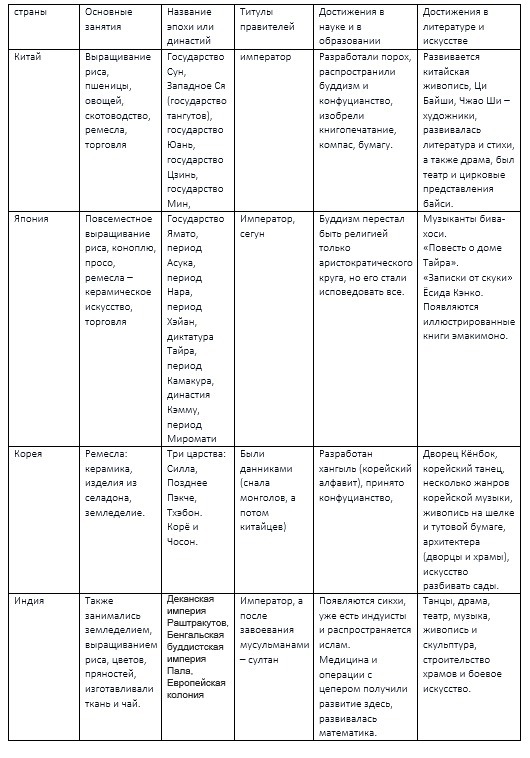 Сравнительная таблица "Страны средневековой Азии" внизу
