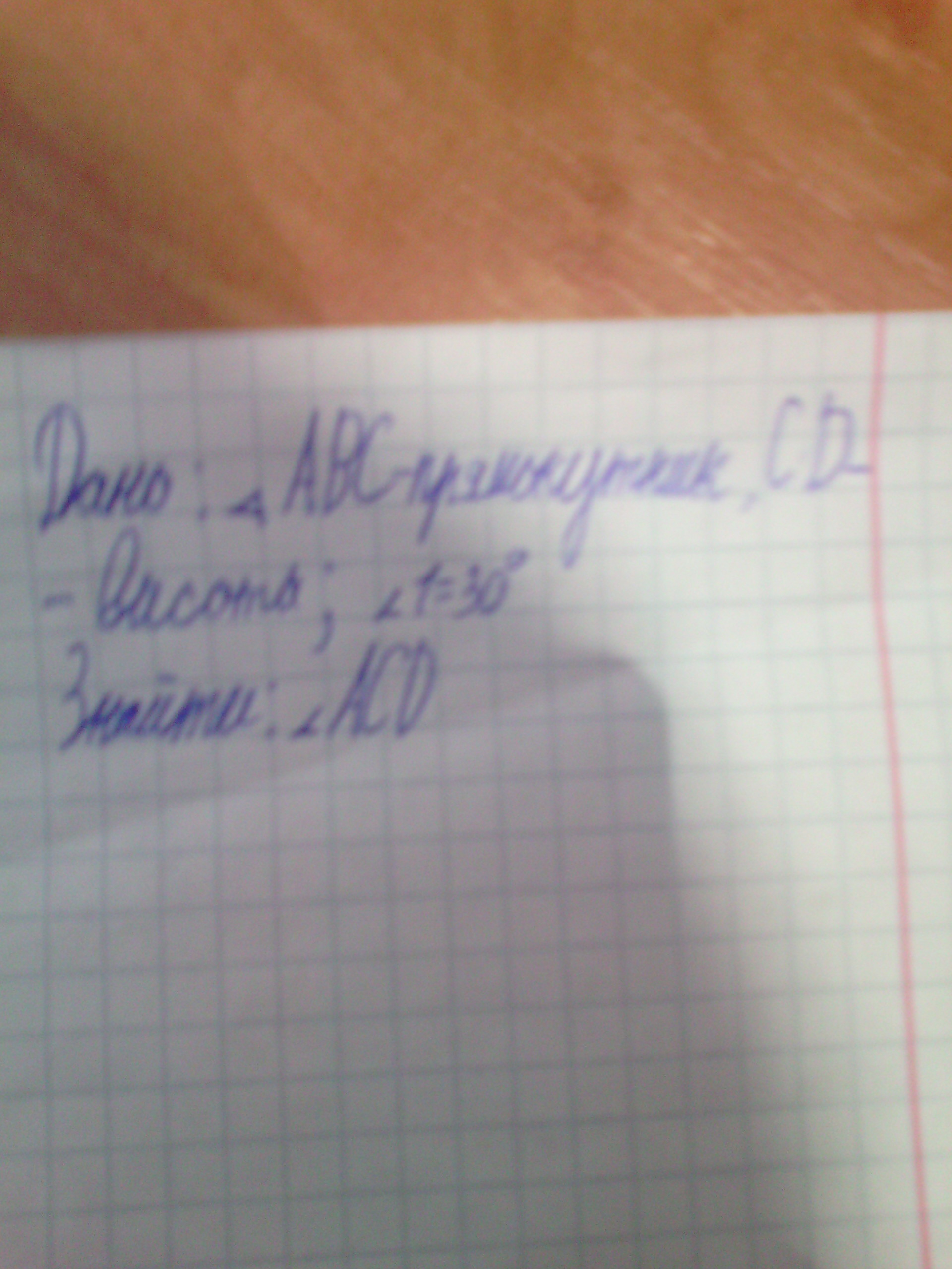 Теперь найдем угол САВ. Сумма всех углов треугольника равна 180. Значит угол САВ=180-(90+30)=60 (Или же можно просто отнять от 90 градусов 30, так как треугольник прямоугольный). Теперь когда нам известны два угла треугольника АСД, мы найдем угол АСД. Угол АСД=90-60=30.
