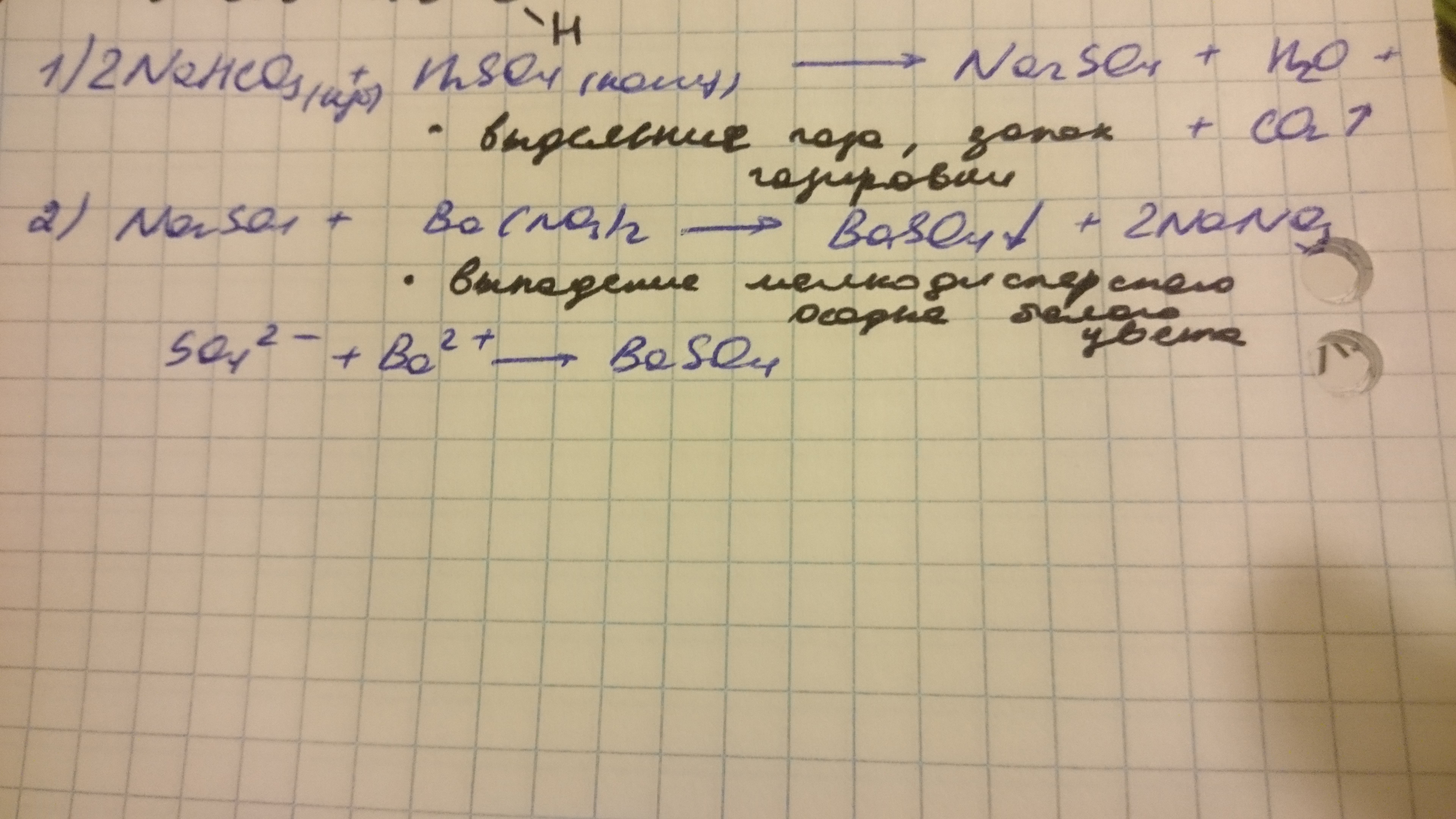 Для проведения эксперимента предложены следующие растворы: NaHCO3, Ba(NO3)2, HCl, LiCl, Na2SO4 и H2SO4(конц). Используя воду и необходимые вещества только из этого списка, получите в две стадии сульфат бария. Опишите признаки проводимых реакций. Для второй реакции напишите сокращённое ионное уравнение