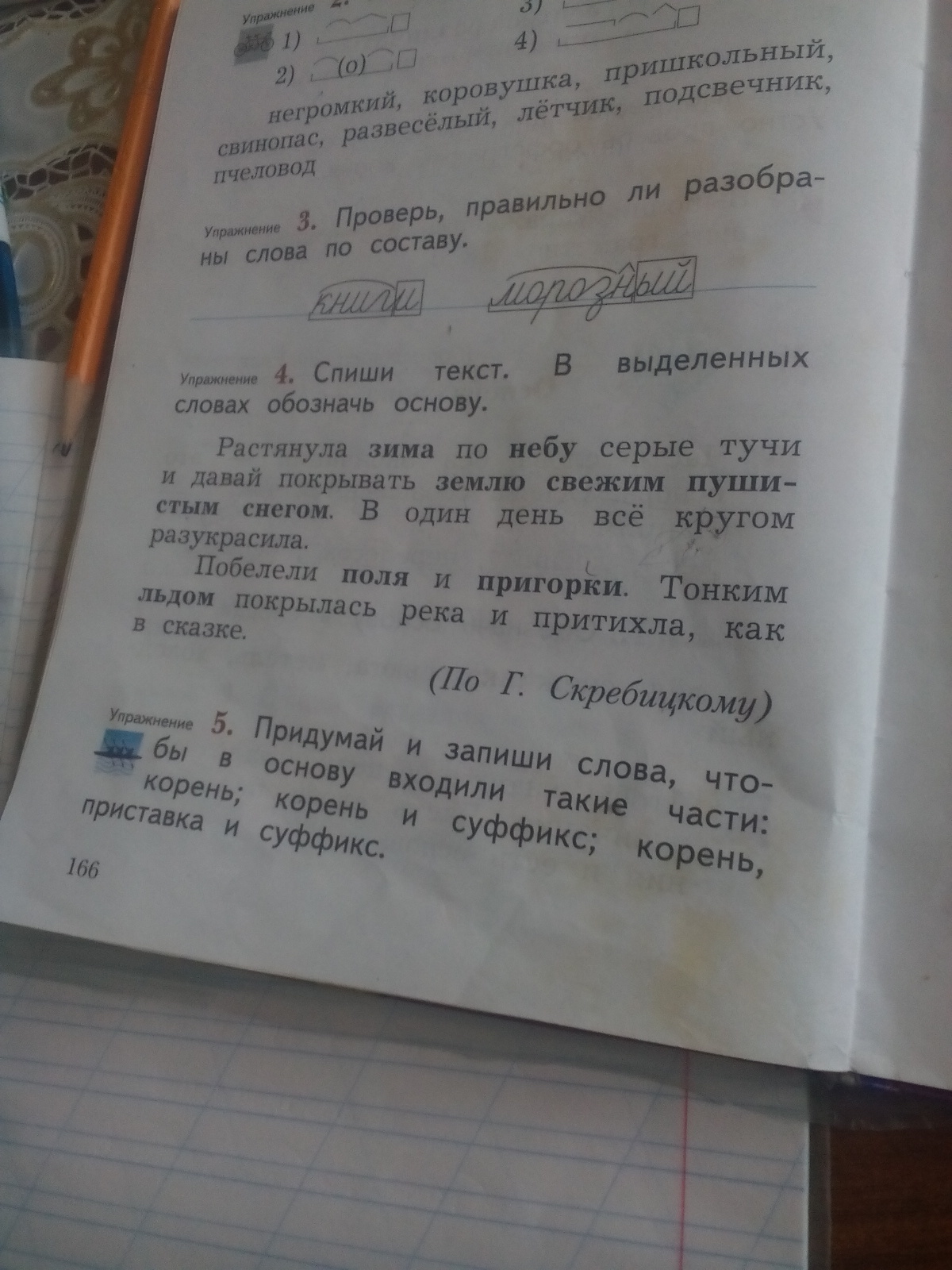 Зима- ЗИМ; Небу- НЕБ; Землю- ЗЕМЛ; Свежим- СВЕЖ; Пушистым- ПУШИСТ; Снегом- СНЕГ; Поля- ПОЛ; Пригорки- ПРИГОРК; Льдом-ЛЬД.