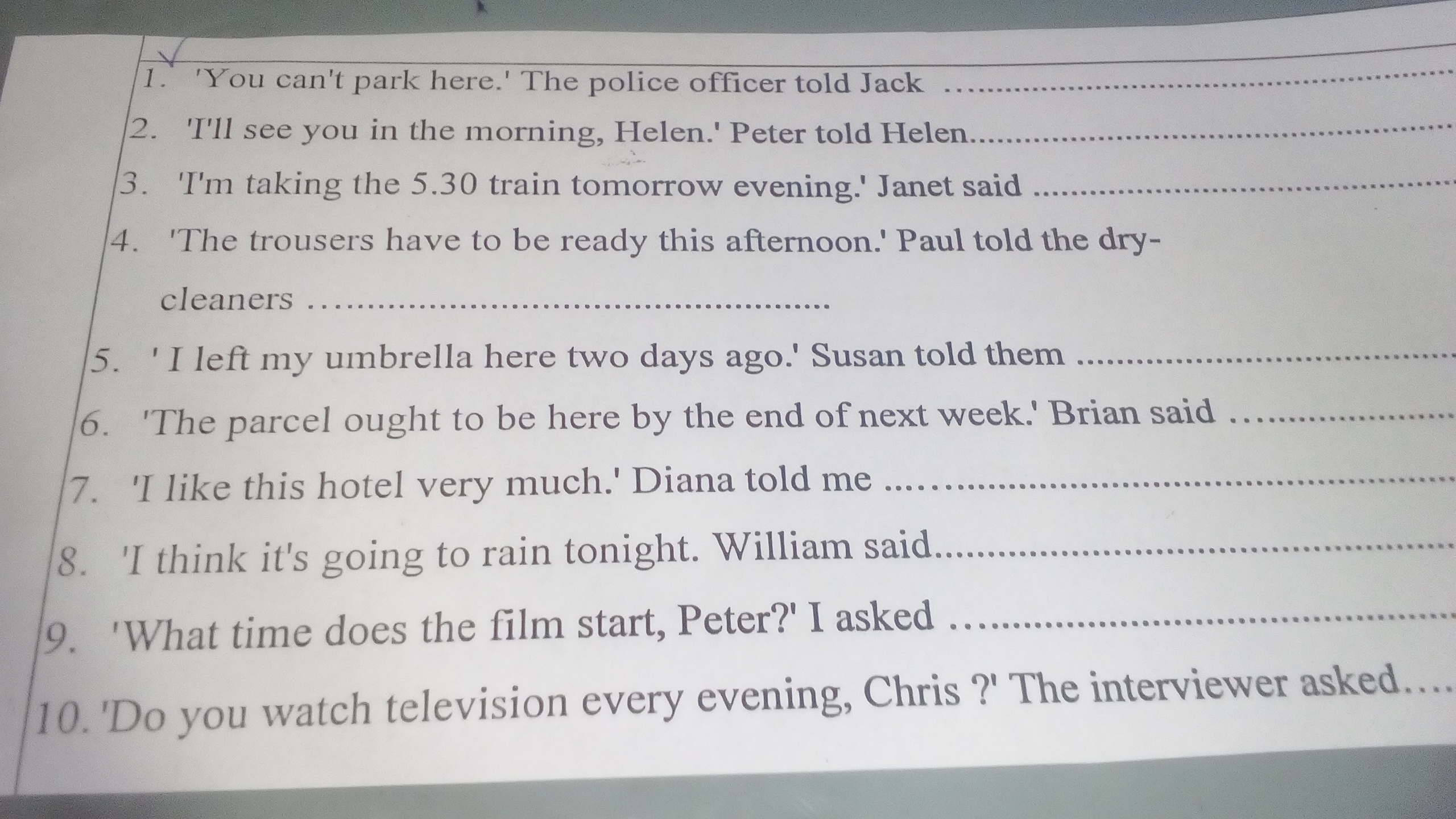 4) Paul told the dry-clearners the trousers had to be ready that afternoon.
