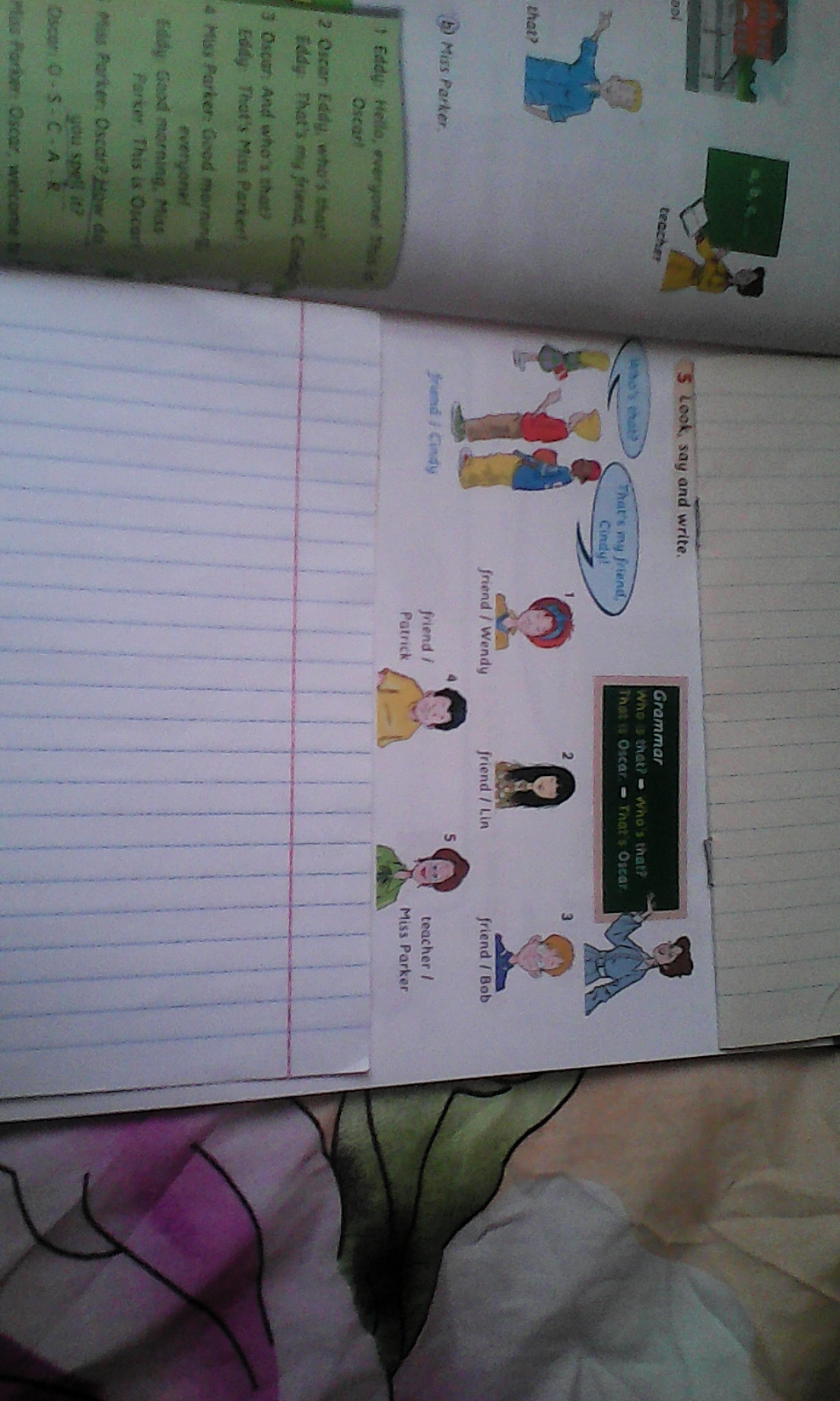 1-Who's that?-That's my friend Wendy.2-Who's that?-That 's my friend Lin.3-Who is that ?-That's my friend Bob.4-Who is that?-That's my friend Patrick.5-Who is that?-That is my teacher Miss Parker.