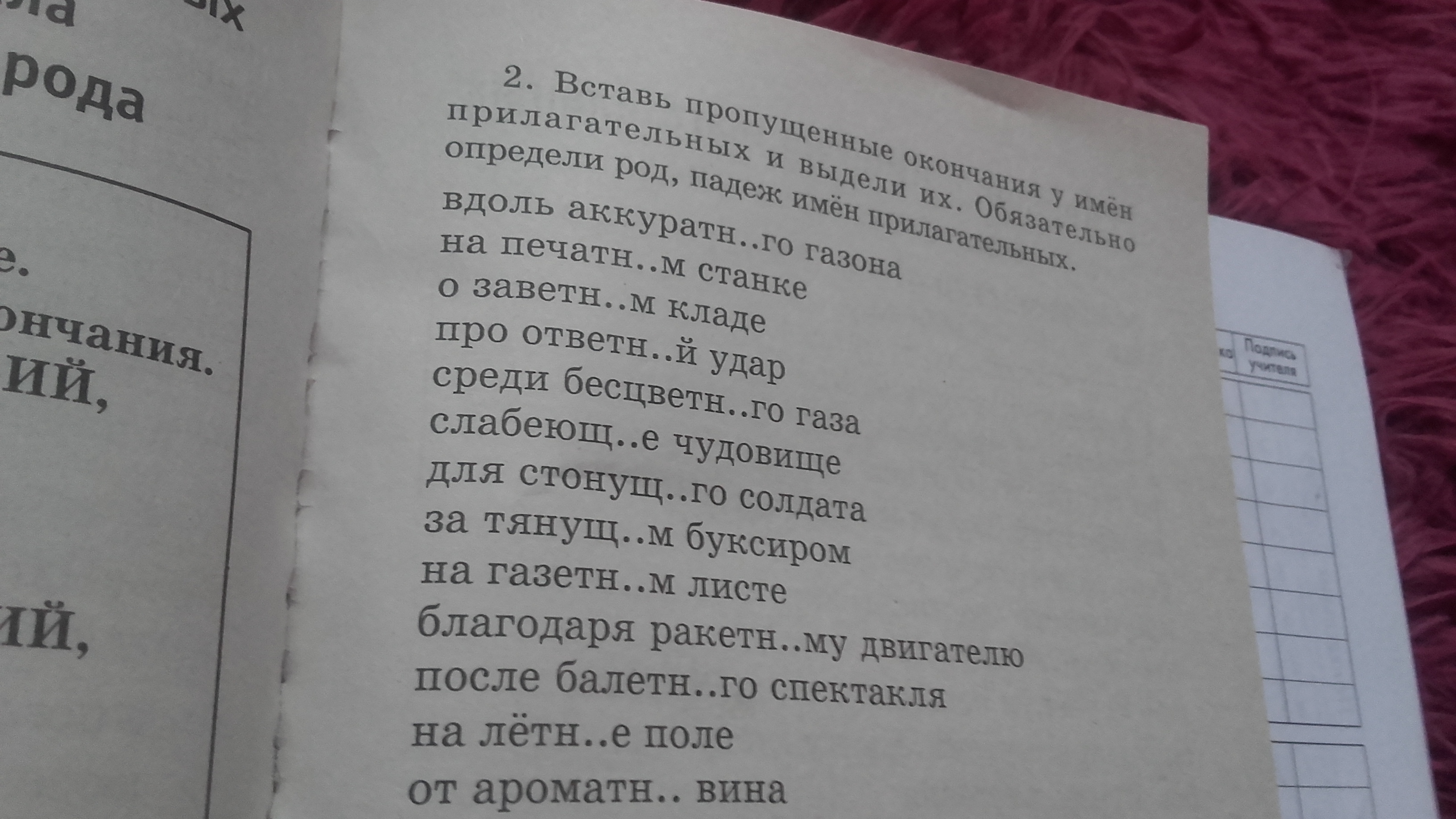 Встает пропущеные окончания у имен прилагательных и выдали из.определи род падеж имен прилагательных