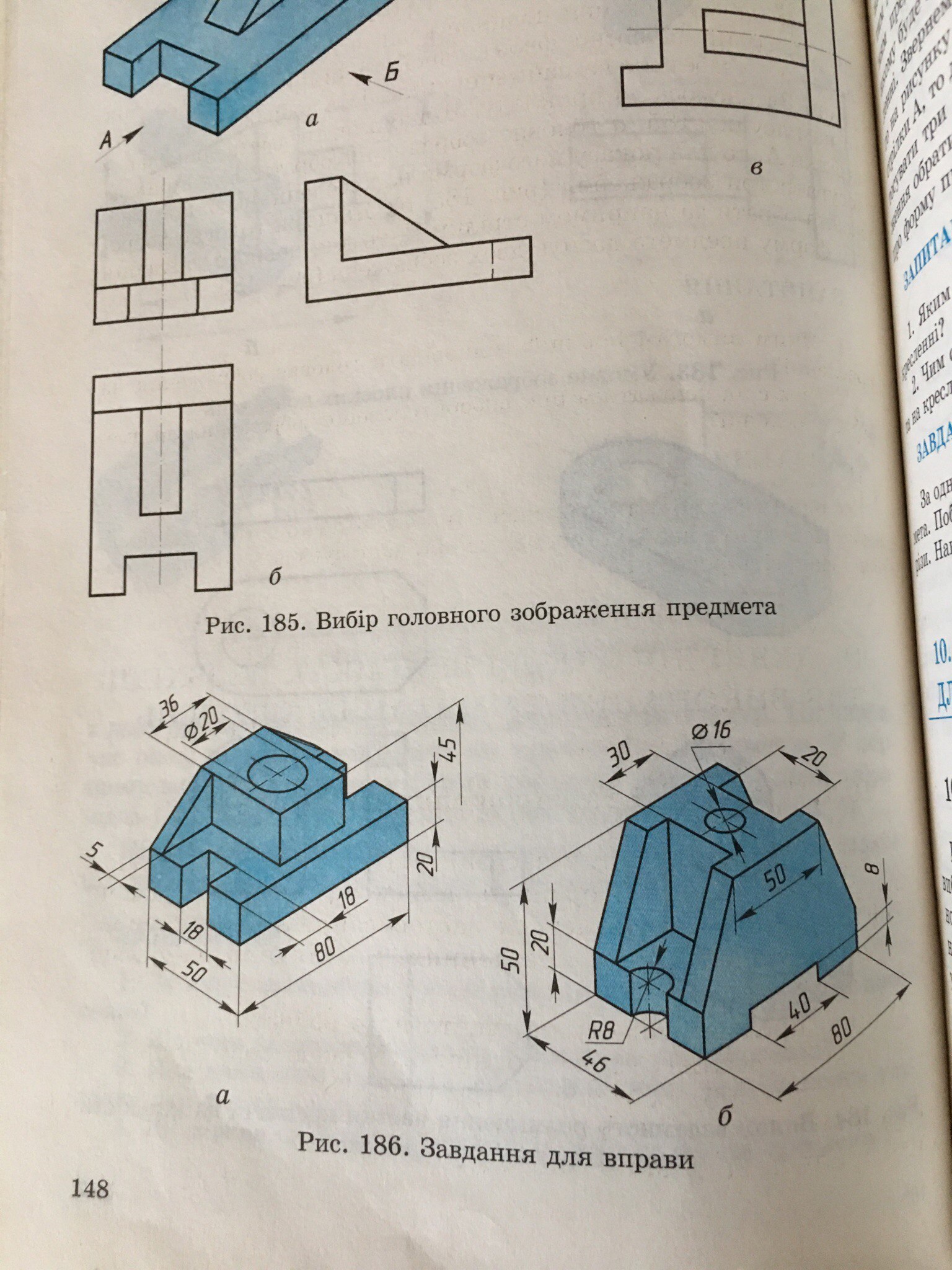 За одним із наочних зображень (рис.186) виконайте ескіз предмета.Побудуйте необхідні зображення ,застосувавши доцільні розрізи.Нанесіть розміри.