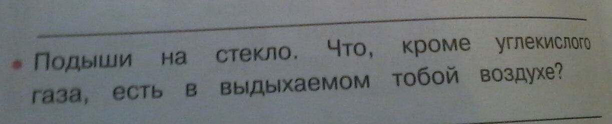 Помогите пожалуйста!Нужно подышать на стекло и написать что кроме углекислого газа есть выдыхаемом воздухе