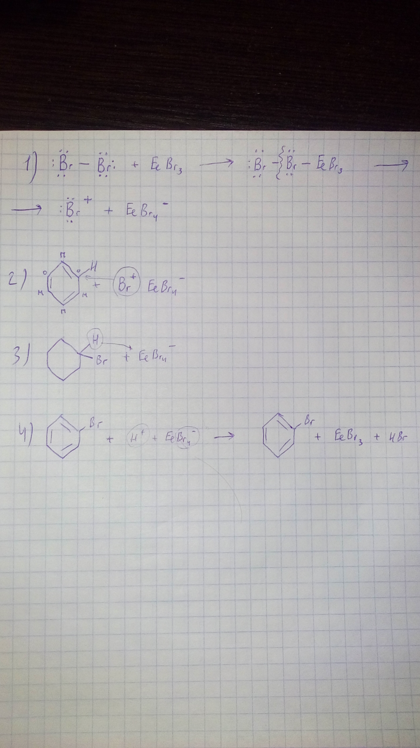 4) конечные продукты реакции (образуется смесь орто- и пара-бромтолуола)