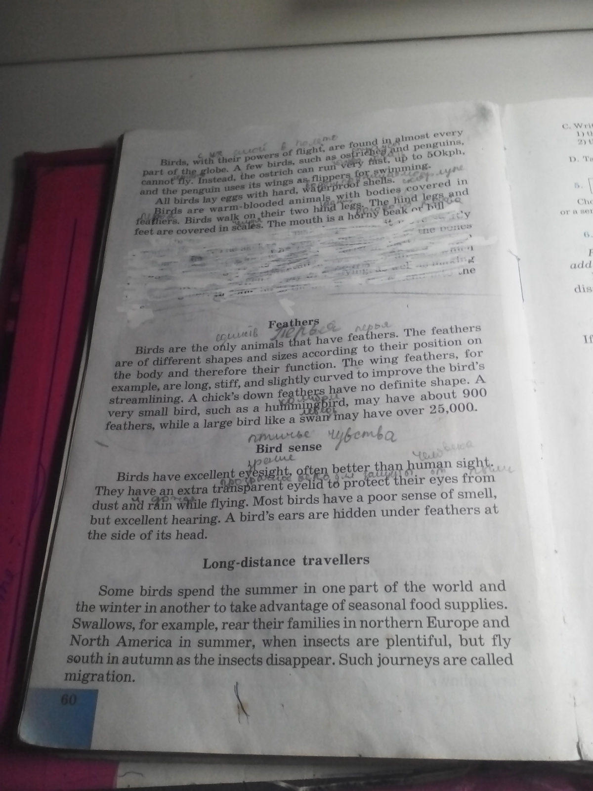 Некоторые птицы проводят лето в одной части земного шара, а зиму в другой, чтобы получить необходимое пропитание. Ласточки, например, создают семьи в северной Европе и Северной Америке летом, когда насекомых там достаточно, но улетают на юг осенью, поскольку насекомые исчезают. Путешествия птиц на юг называются миграцией.