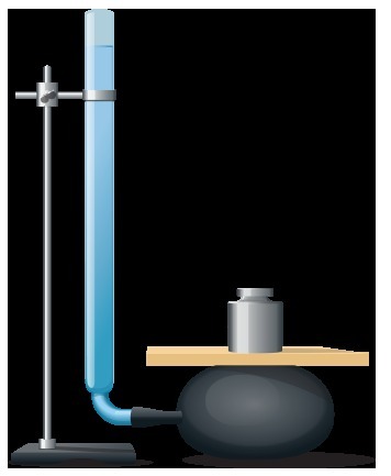 На рисунке изображена волейбольная камера, соединённая с вертикально расположенной стеклянной трубкой. В камере и трубке находится вода. На камеру положена дощечка, а на неё гиря массой 2 кг. Высота столба воды в трубке 0,7 м.