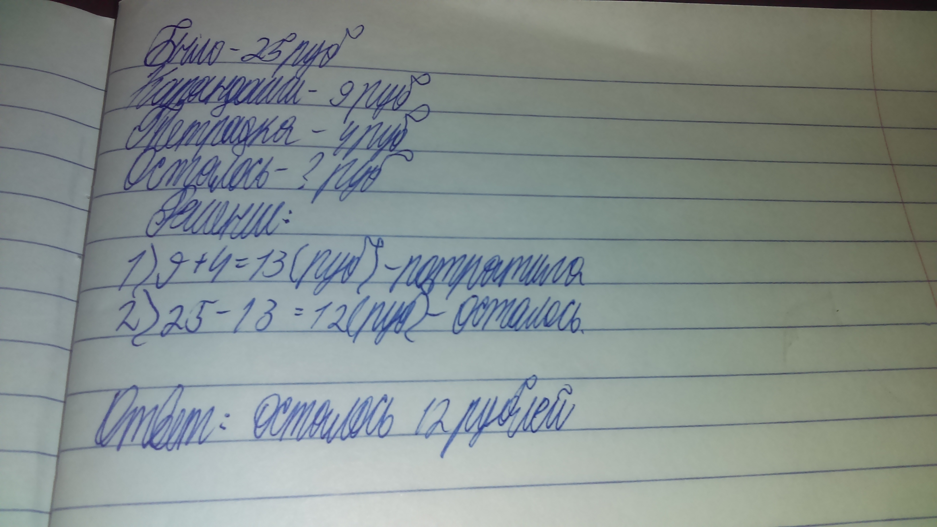 у девочки было 25 руб. она потратила на карандаши 9 руб. а на тетрадку 4 руб. сколько денег осталось у девочки?