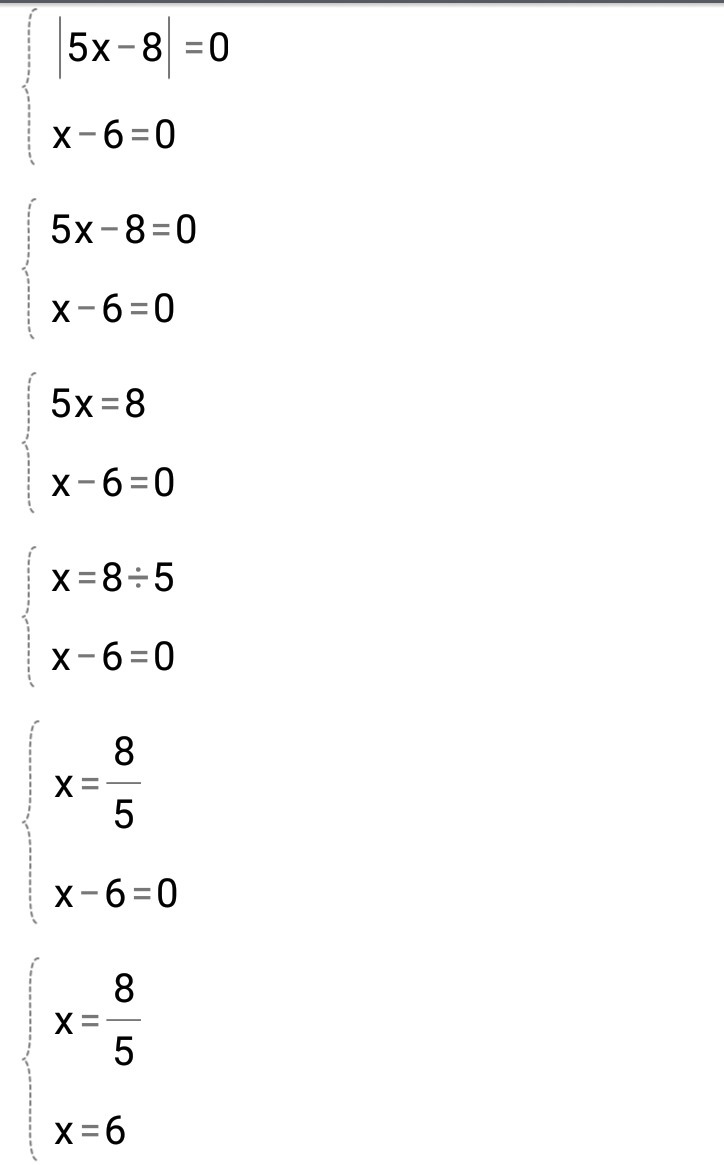 Произведение равно 0,когда хотя бы один из множителей равен 0. Отсюда получаем,что или x-6=0(x=6),либо 5x-8=0(модуль равен 0,когда подмодульное равно 0)