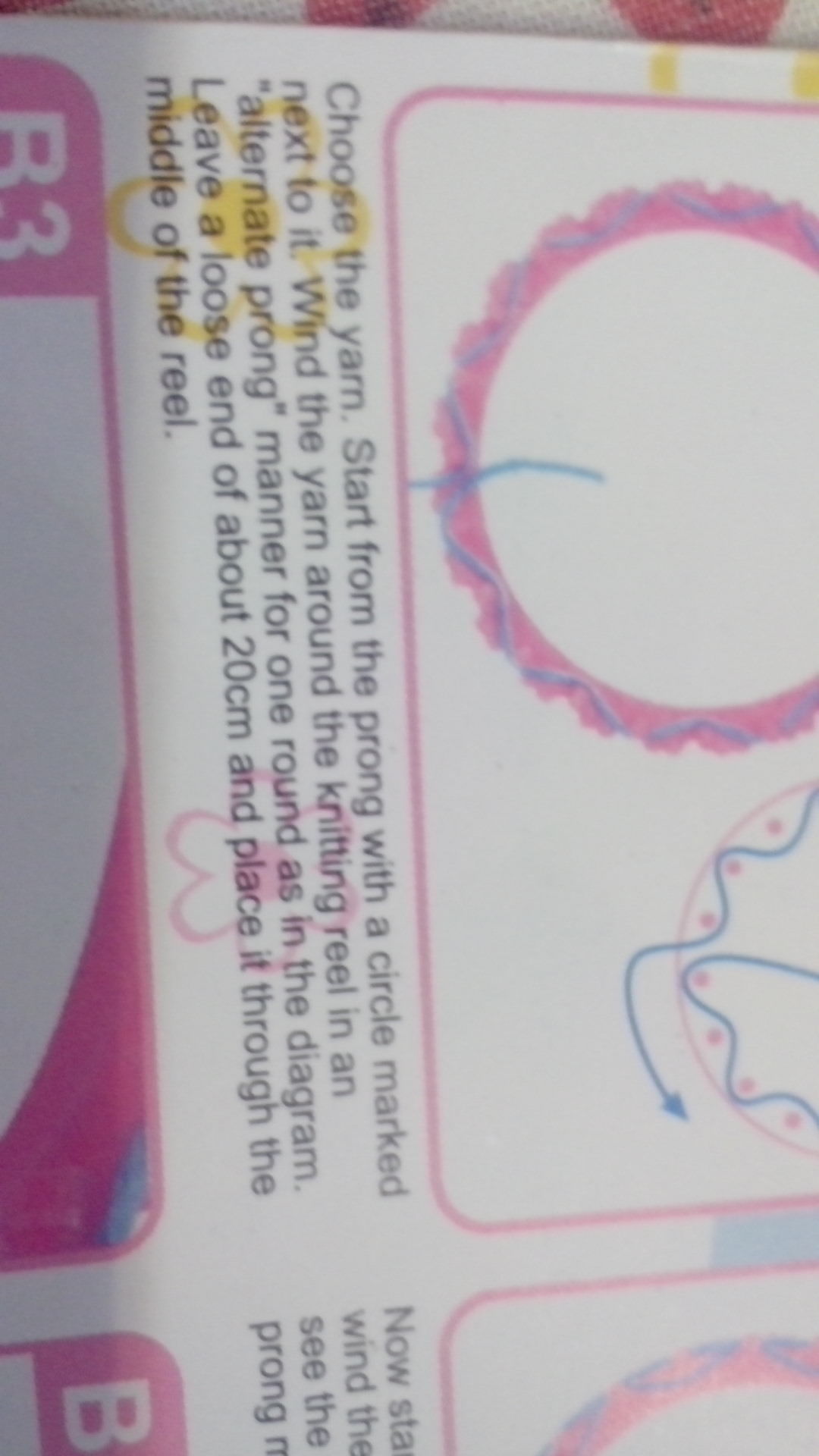 Выберите пряжу. Начните с зубца с кругом отмеченной рядом с ним. Ветер нить вокруг вязания катушки в "альтернативный" зубец образом на один раунд, как в диаграмме Оставьте свободный конец около 20 см и поместите его через середину барабана