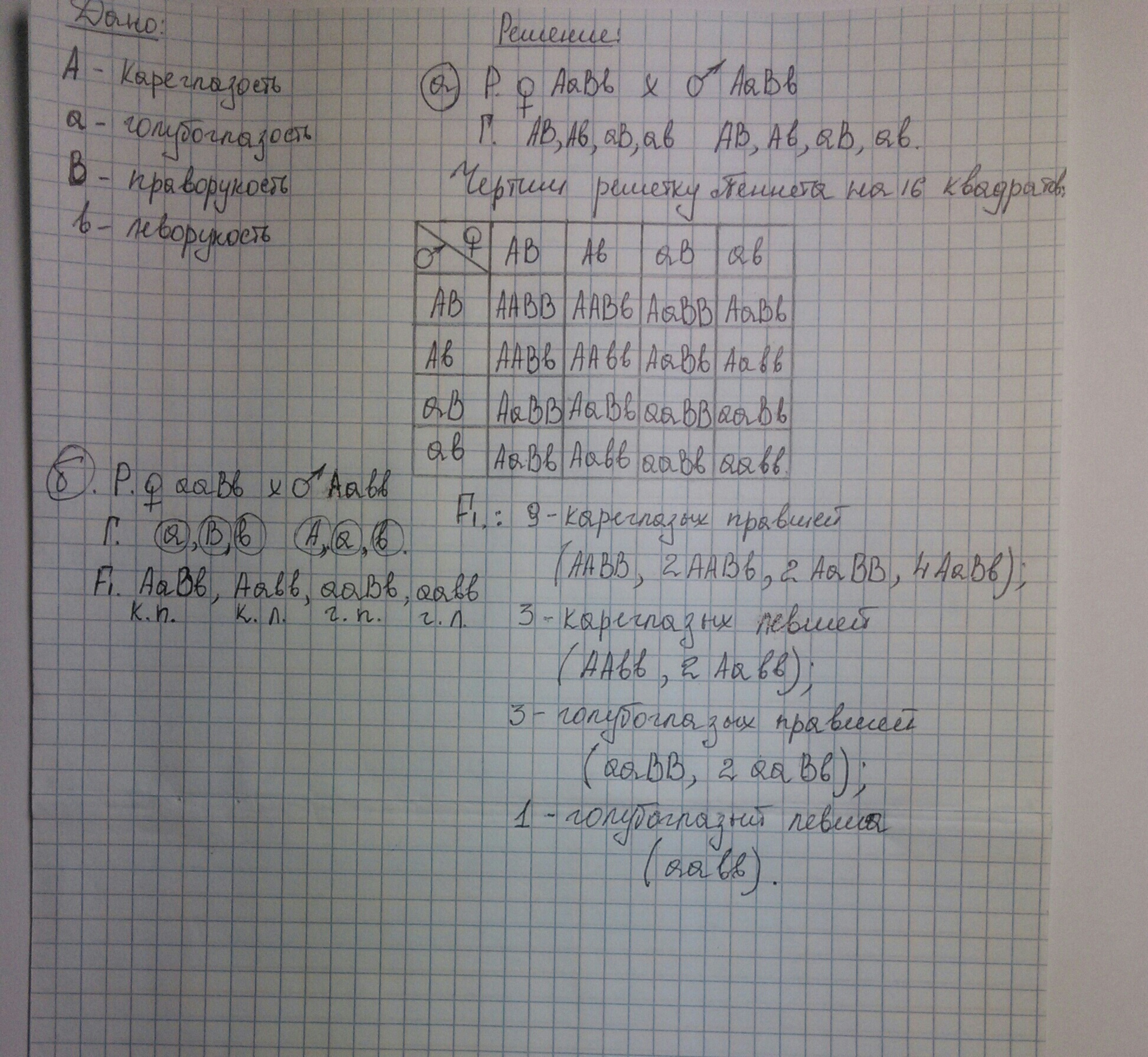 б) отец левша, но гетерозиготен по цвету глаз, а мать голубоглазая, но гетерозиготная в отношении умения владеть руками. Пжл)