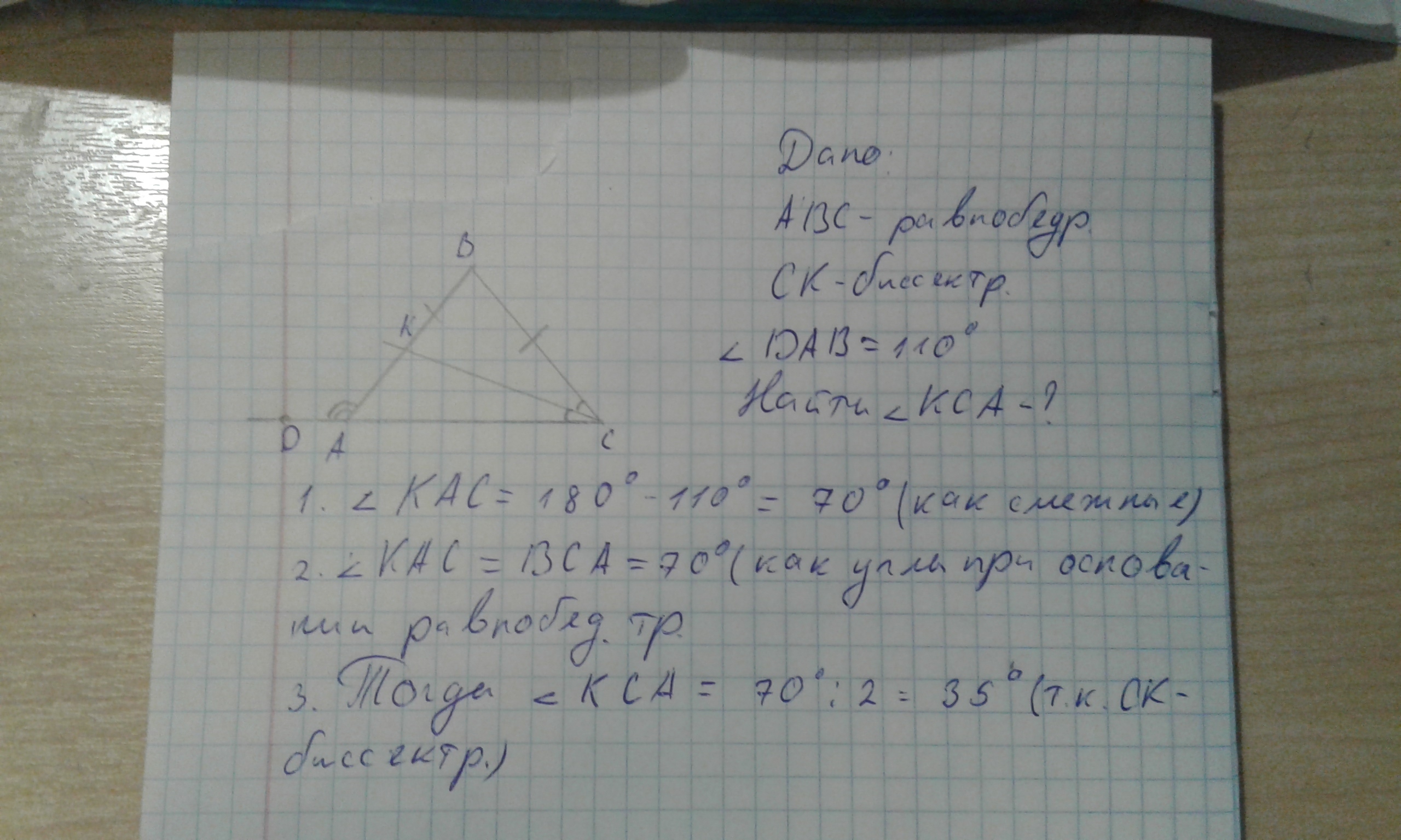В равнобедренном треугольнике ABC с основанием AC проведена биссектриса CK. Точка D лежит на продолжении стороны AC так, что точка A лежит между точками D и C. Угол DAB равен 110 градусам. Найдите угол KCA. Ответ дайте в градусах. HELP!!