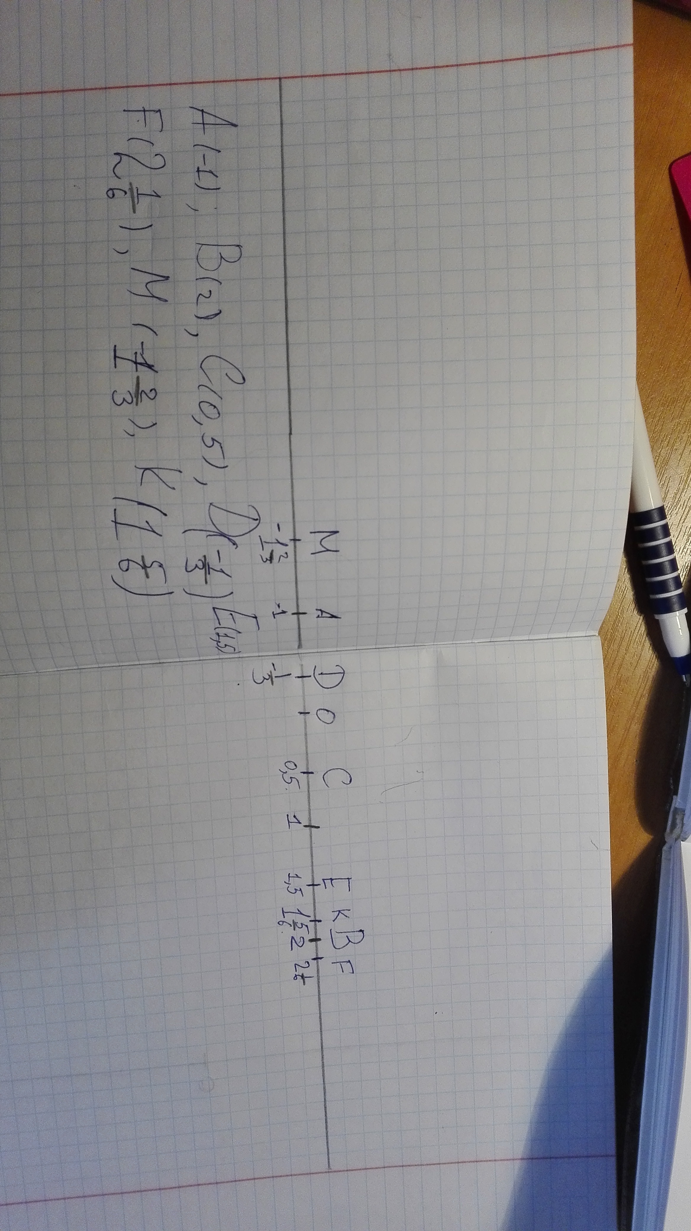Начертить числовую прямую, взяв за единичный отрезок шесть клеточек тетради, обозначить точки: А(-1), В(2),С(0,5), D(-1/3), Е (1,5), F(-2 целых 1/6), М (-1 целая 2/3), К(1 целая 5/6)