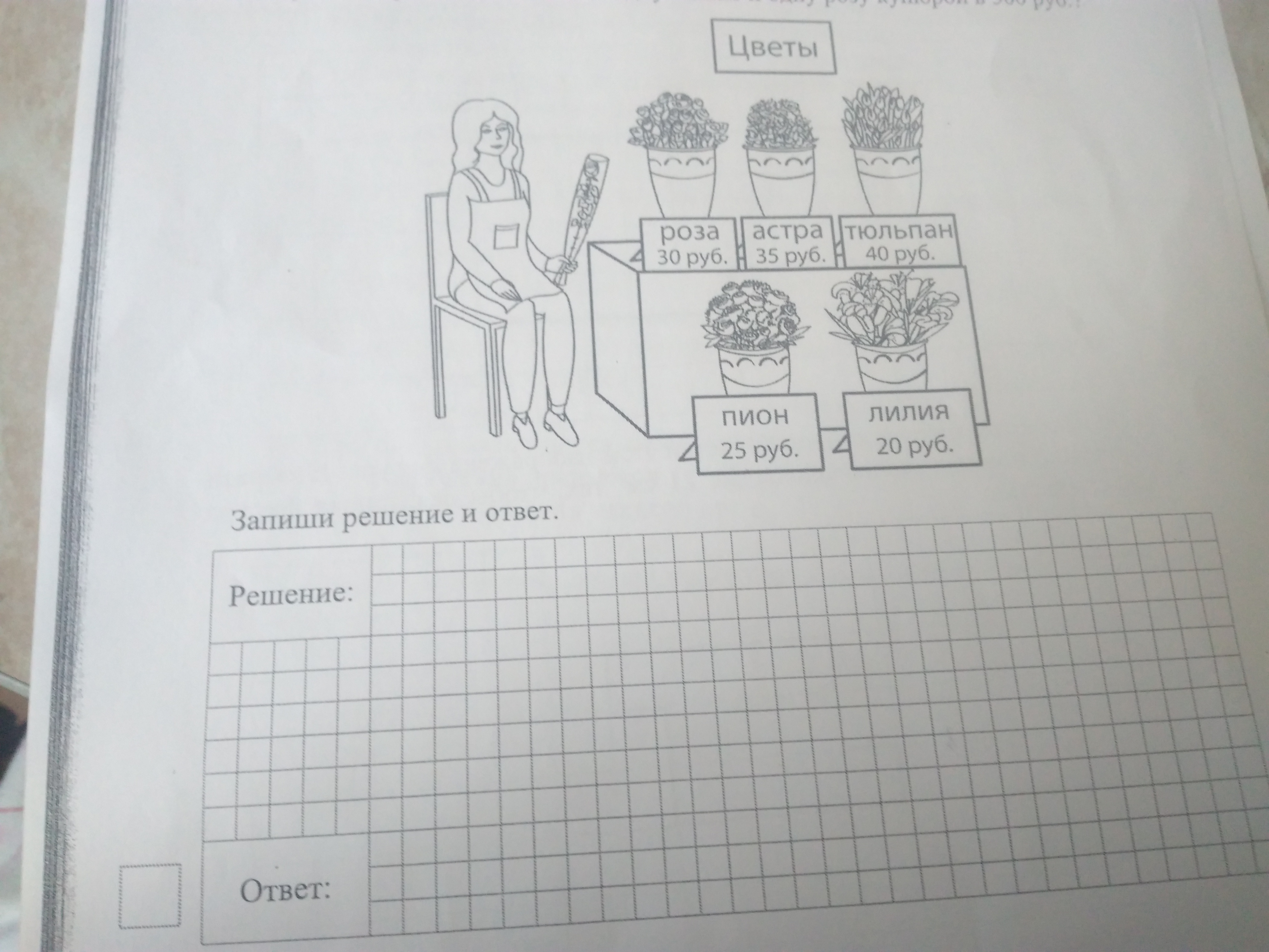 Рассмотри рисунок и ответь на вопрос сколько рублей сдачи получит покупатель расплатившийся за одну лилию и одну розу купорос в 500 руб.