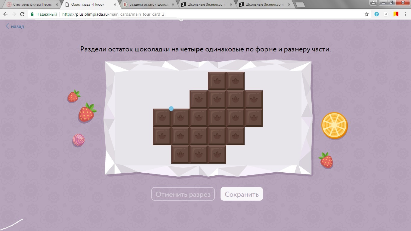 Раздели остаток шоколадки на 4 одинаковые по форме и размеру части.