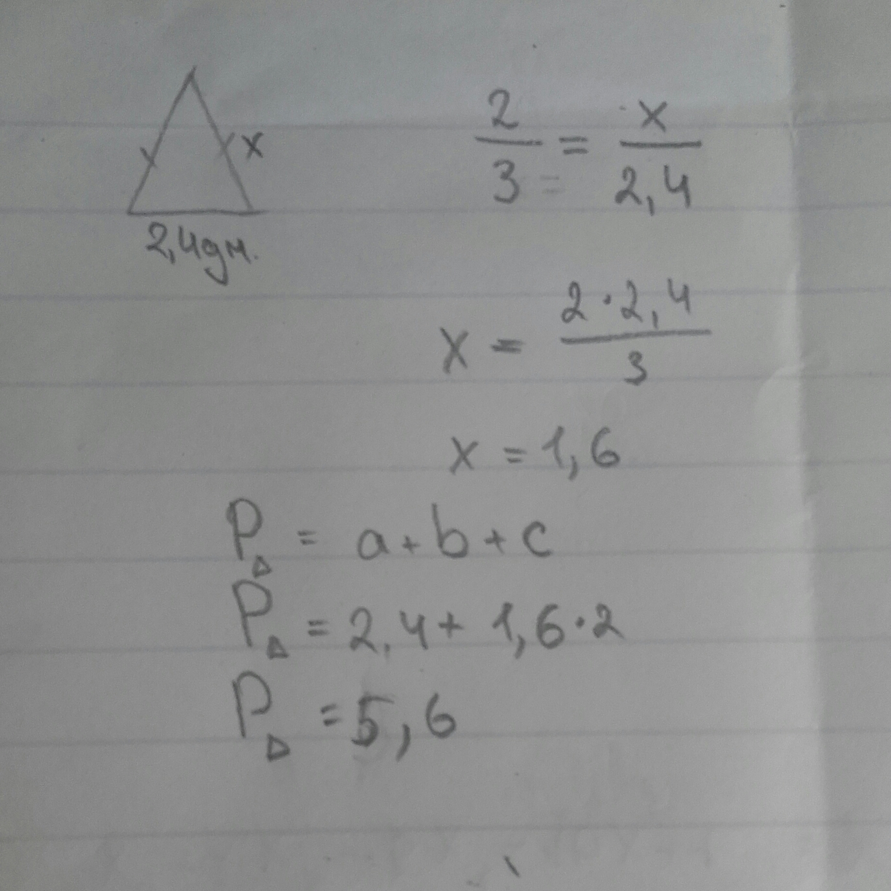основание равнобедренного треугольника равно 2,4дм.Боковая сторона равна 2/3 длины основания.Найдите периметр этого треугольника