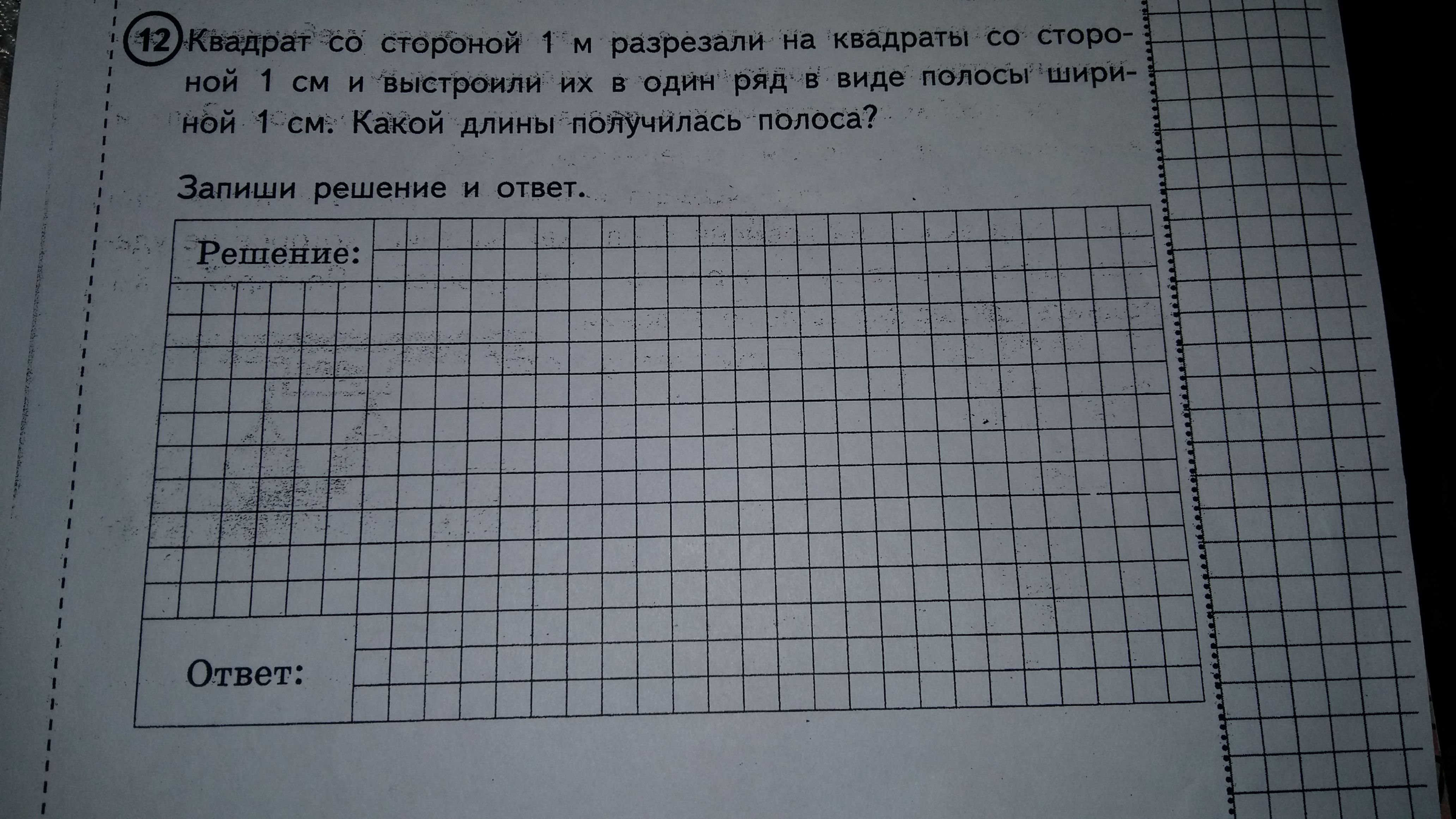 1*1= 1 м2= 10000см2 площадь и квадрата и полосы , кот. сделали при разрезании.