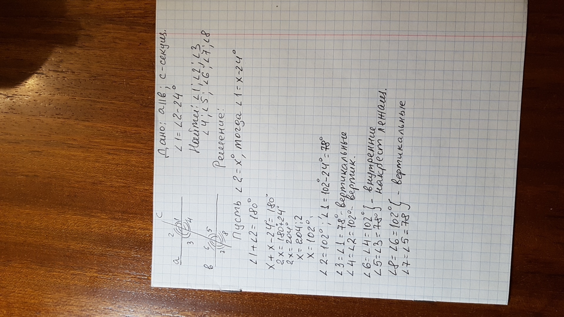 Найдите все углы,образованные при пересечении двух параллельных прямых секущей если одна из них на 24 гр.меньше другого