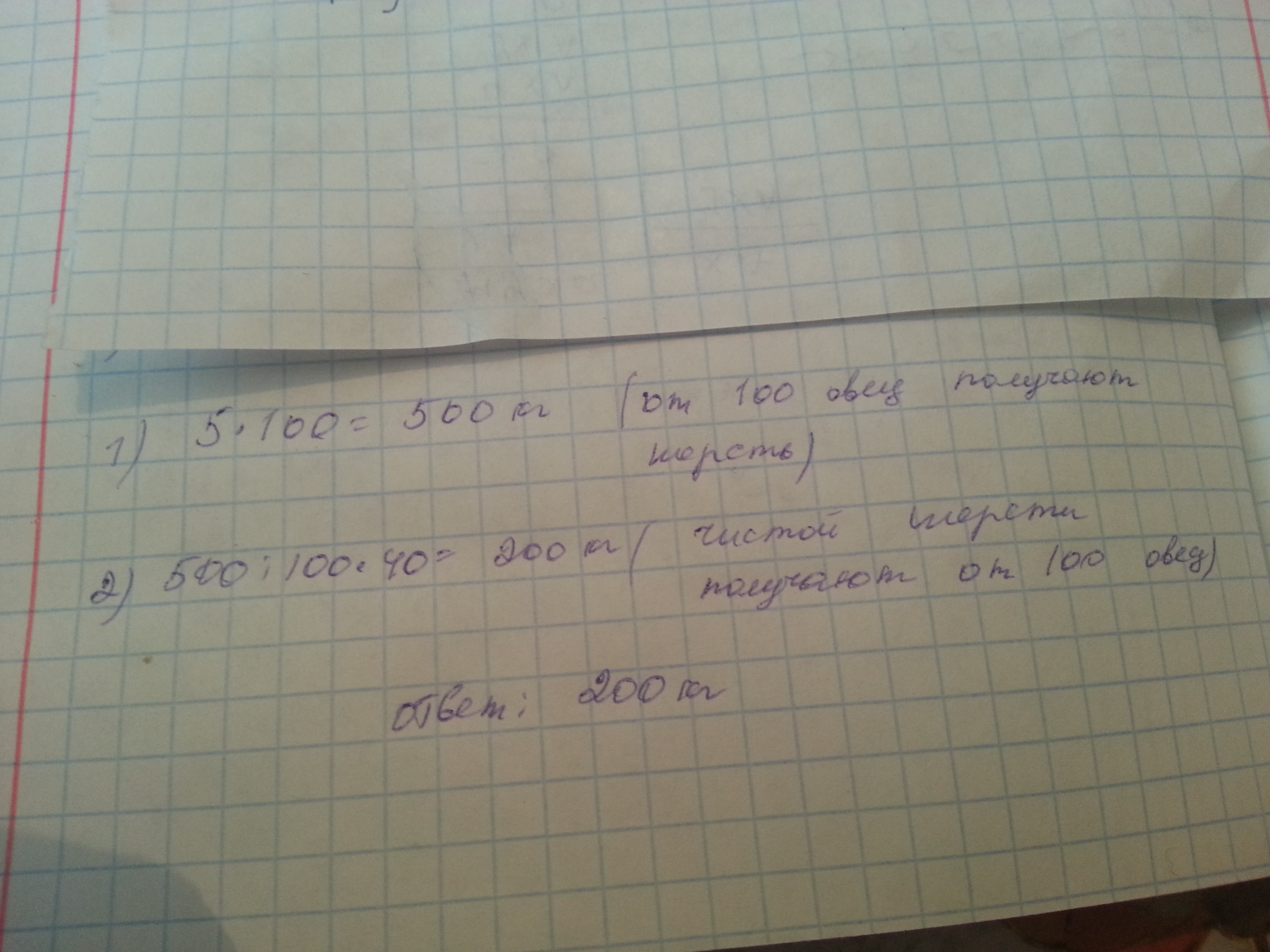 Годовой настриг шерсти с овцы тонкорунной породы равен примерно 5кг. Выход чистой шерсти после промывки составляет 40%. Сколько чистой шерсти можно получить от 100 овец?