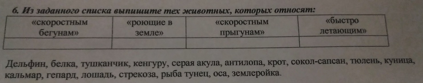 Белка,антилопа ,куница,гепард,лошадь,серая акула,дельфин,рыба тунец,кальмар